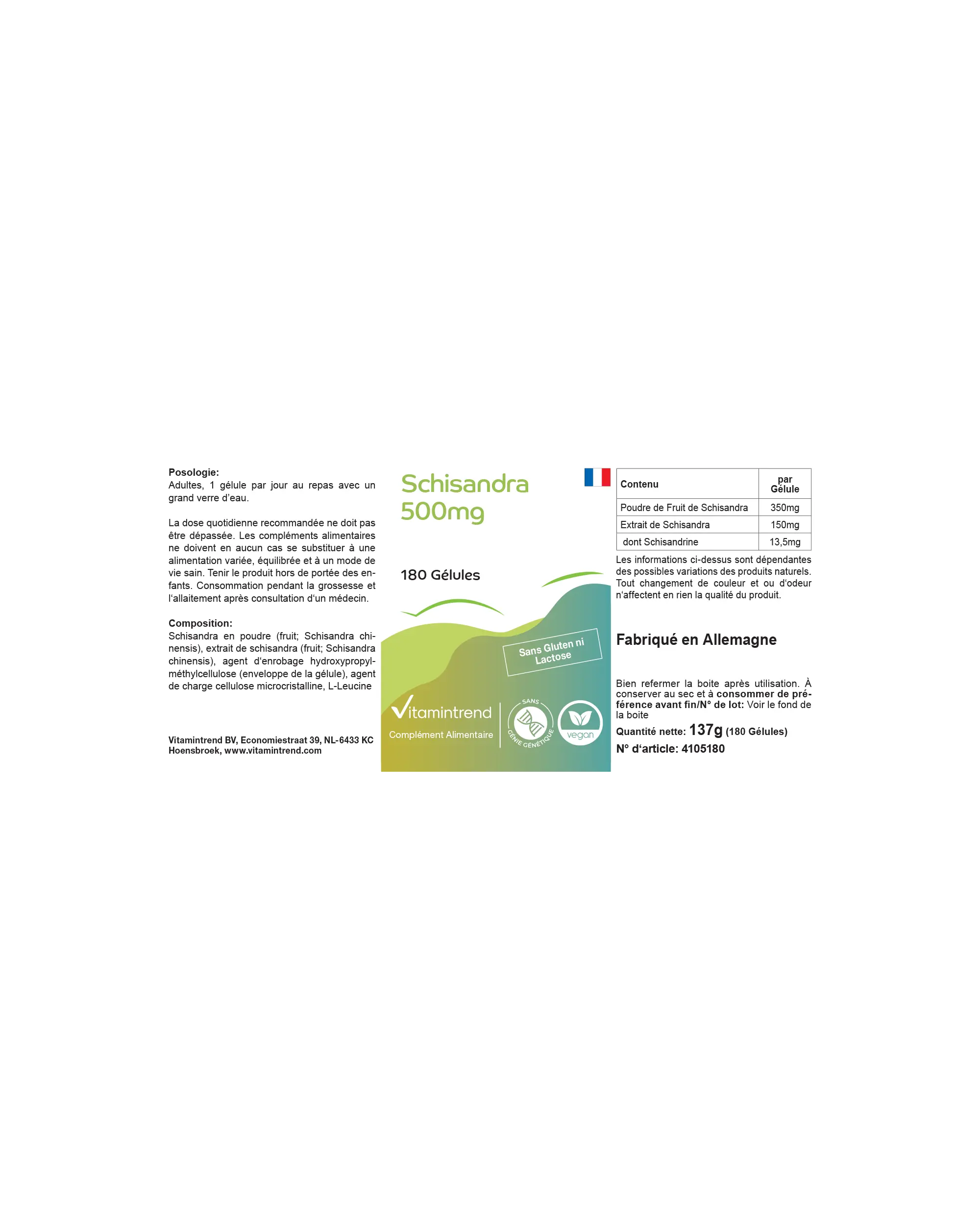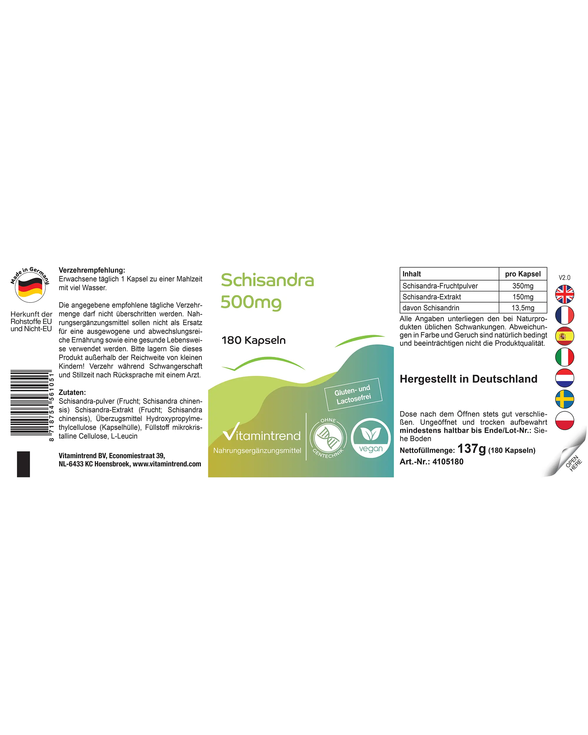 Schisandra-pulver (Frucht; Schisandra chinensis) Schisandra-Extrakt (Frucht; Schisandra chinensis), Überzugsmittel Hydroxypropylmethylcellulose (Kapselhülle), Füllstoff mikrokristalline Cellulose, L-Leucin| Inhalt / Supplement Facts / Contenu / Información Nutricional / Contenuto / Inhoud | pro Kapsel / per Capsule / par Gélule / por Cápsula / per Capsula / per Capsule |