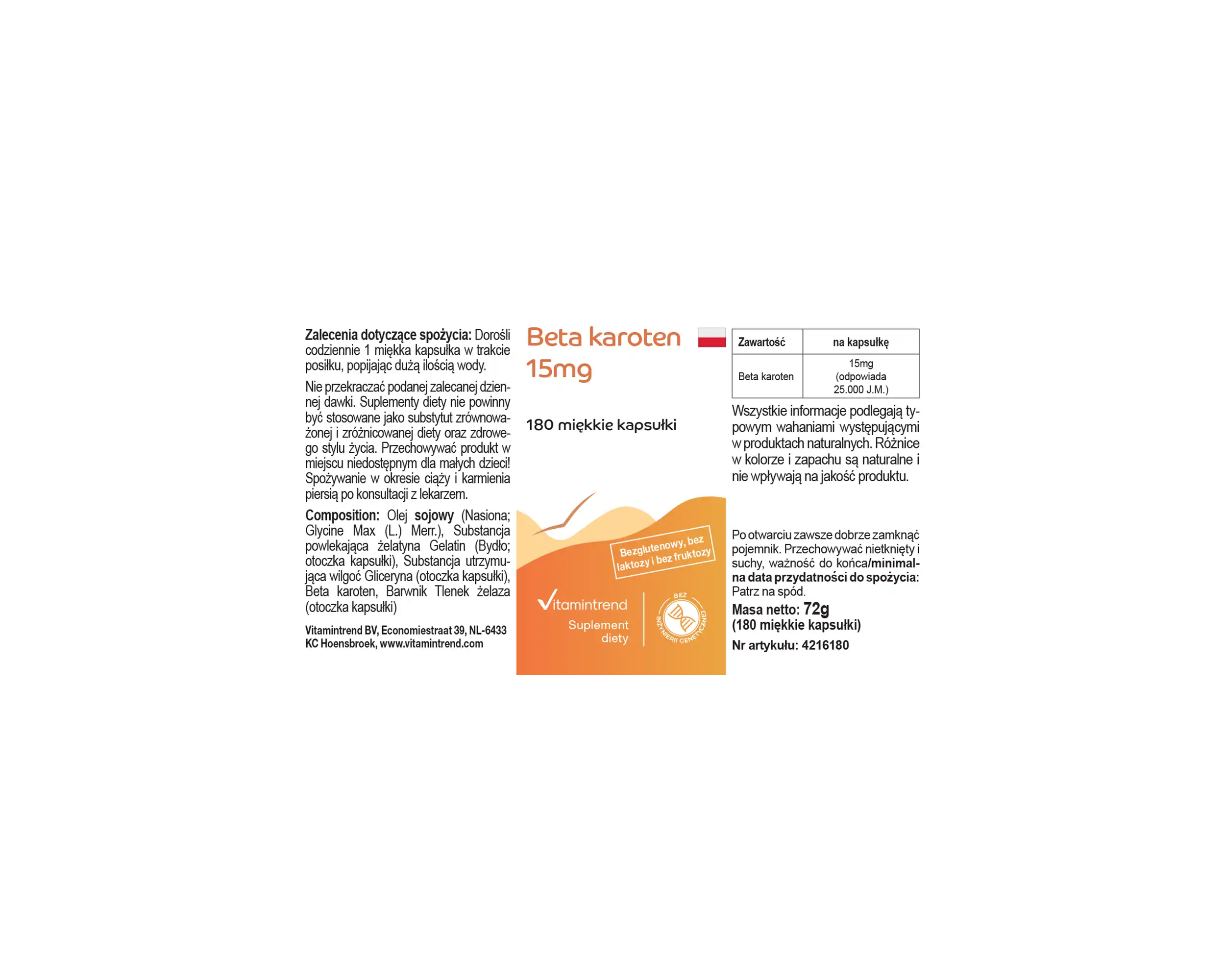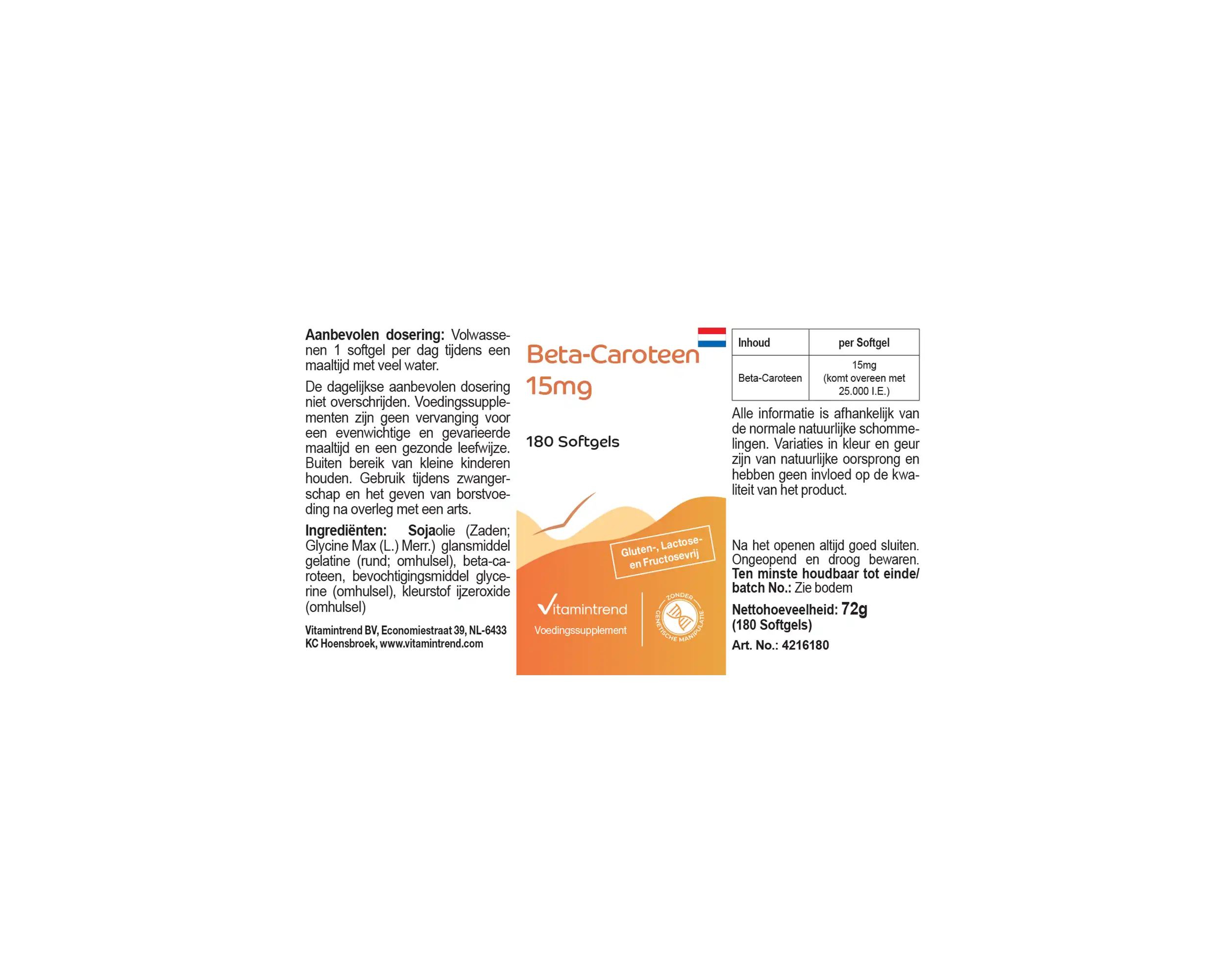 Vitamintrend’s beta-carotene softgels contain 15 mg of beta-carotene per softgel, equivalent to 25,000 IU of beta-carotene. Beta-carotene is part of the carotenoid family and is regularly consumed through the diet. The softgel format allows for easy and convenient integration into everyday life.
