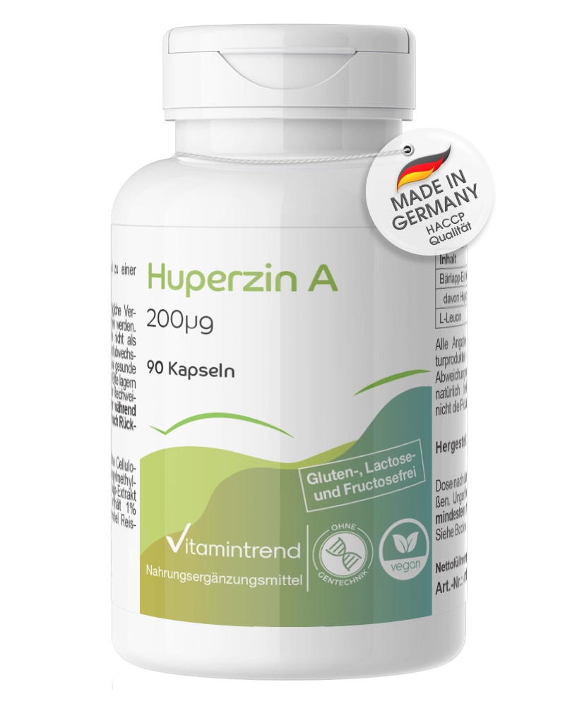 standardized extract 200μg huperzine A per capsules and daily intake small capsules, easy to swallow vegetarian and vegan gluten-free, lactose-free, fructose-free without magnesium stearate and silicon dioxide Note: Due to legal regulations, we cannot make additional statements about the effects of vital nutrients. For further information, we recommend consulting specialized literature or websites. Inhalt / Supplement Facts / Contenu / Información Nutricional / Contenutopro Kapsel / per Capsule / pour Gélule / por Cápsula Bärlapp-Extrakt / Club Moss Extract / Extrait de Lycopodium / Extracto de Licopodio / Estratto di Licopodio / Lycopodium-Extract 20mg davon Huperzin A / of which Huperzine A / dont Huperzine A / de los cuales Huperzina A / di cui Uperzina A / waarvan Huperzine A 200μg L-Leucin / L-Leucine / L-Leucina 10mg Content: 180 capsulesRecommended intake: Adults 1 capsule daily with a meal and plenty of water.Not suitable for pregnant and breastfeeding women.One capsule contains:Club moss extract 20mg of which huperzine A 200μgL-Leucin 10mgIngredients: bulking agent microcrystalline cellulose, glazing agent hydroxypropylmethylcellulose (capsule shell), club moss extract (whole herb, contains 1% huperzine A; Huperzia Serrata Thunb.), L-Leucin, anti-caking agent rice extract blend