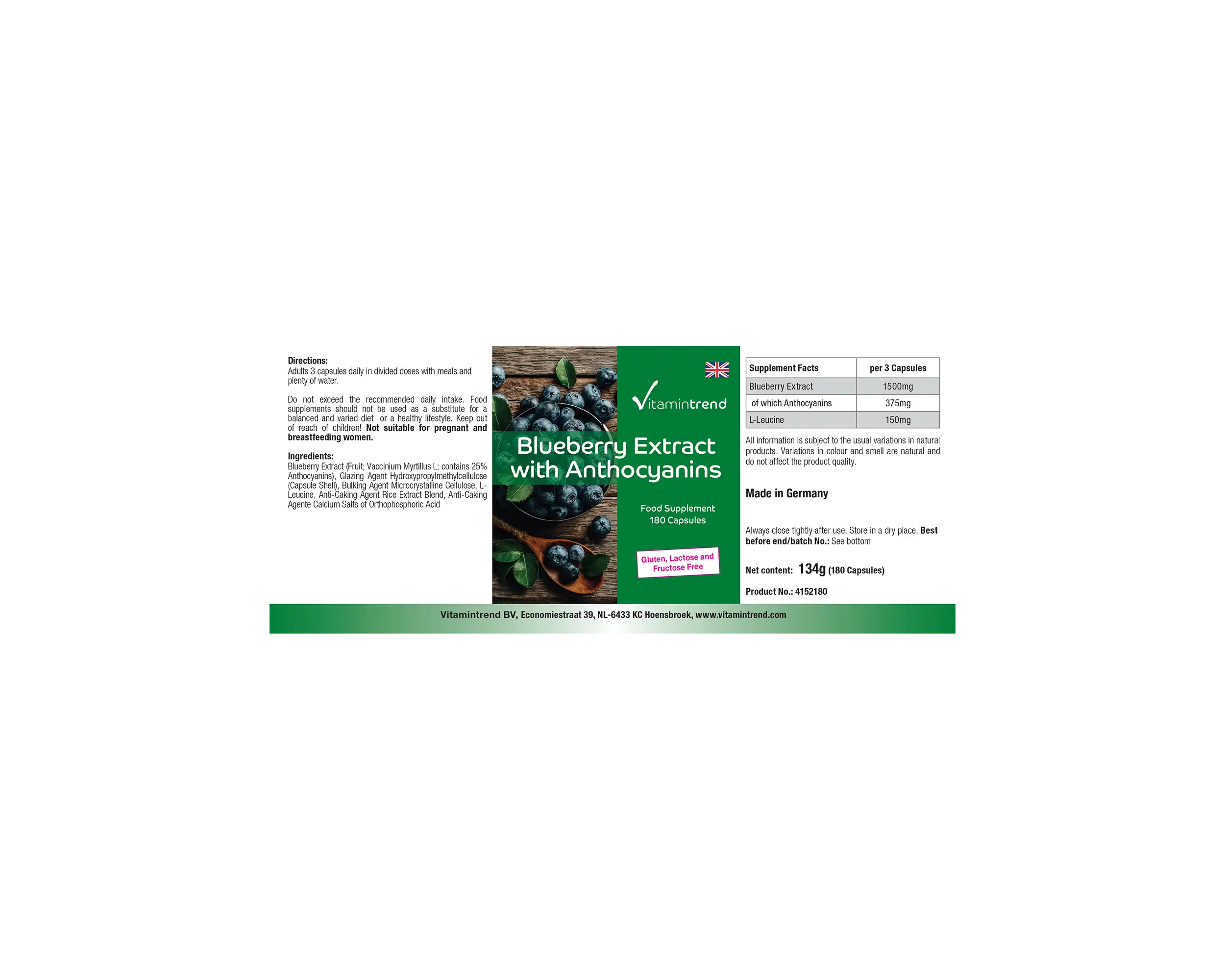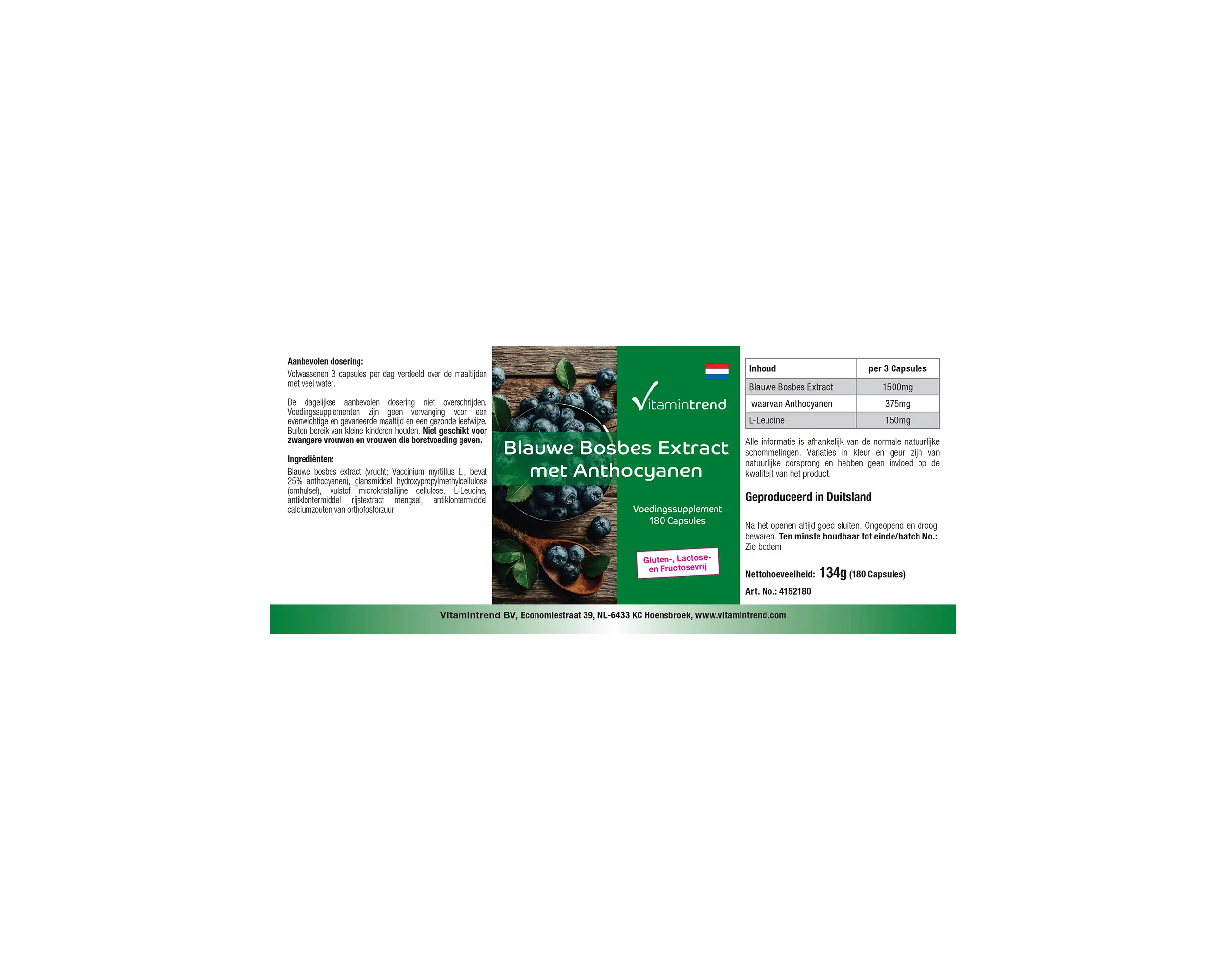ingrediënten: bosbessenextract (Vaccinium myrtillus L., bevat 25% anthocyanen), glansmiddel hydroxypropylmethylcellulose (capsulehuls), vulstof microkristallijne cellulose, L-leucine, rijstextractenmengsel