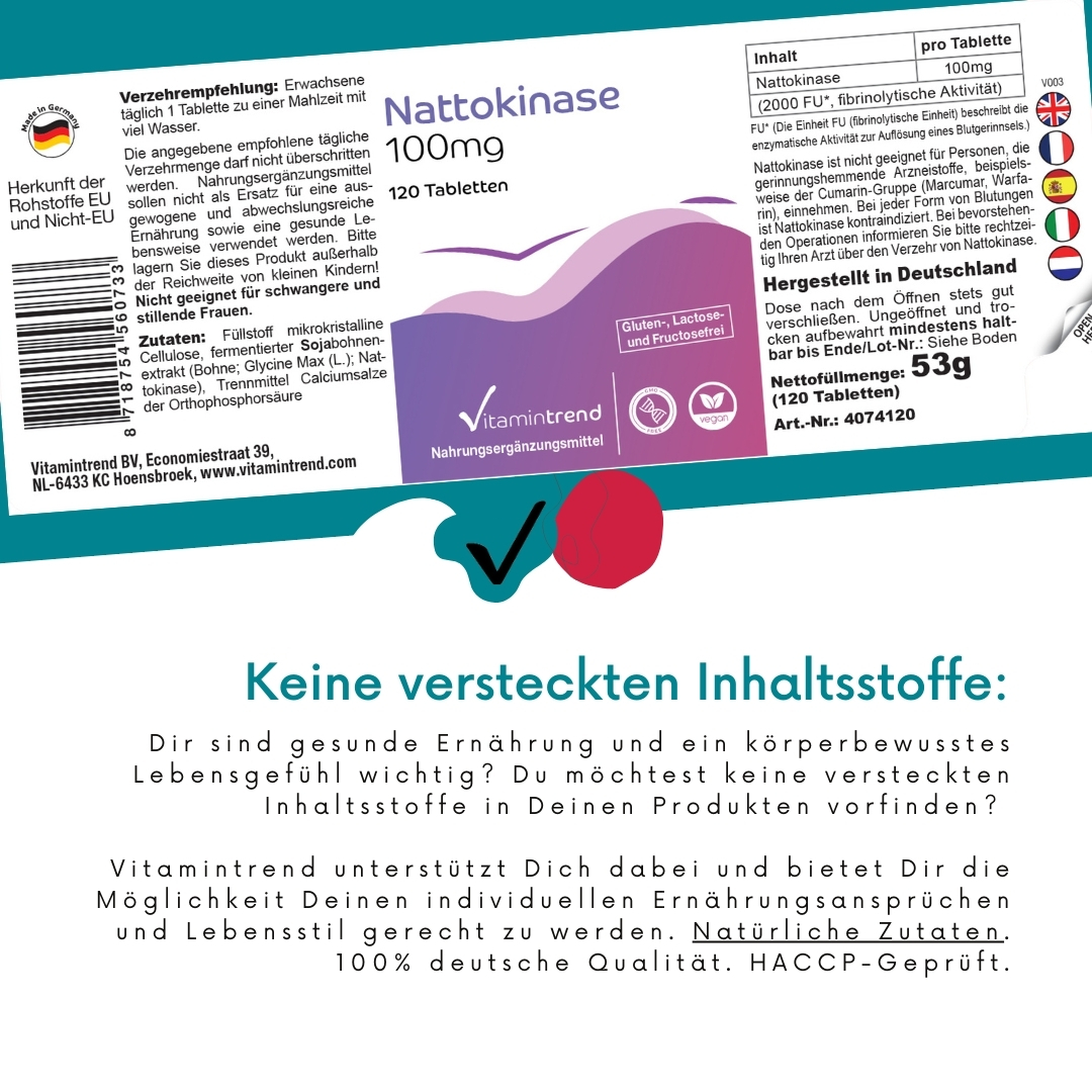 Productinformatie "Nattokinase 100mg - 120 tabletten 2000 FU bulkverpakking voor 4 maanden"