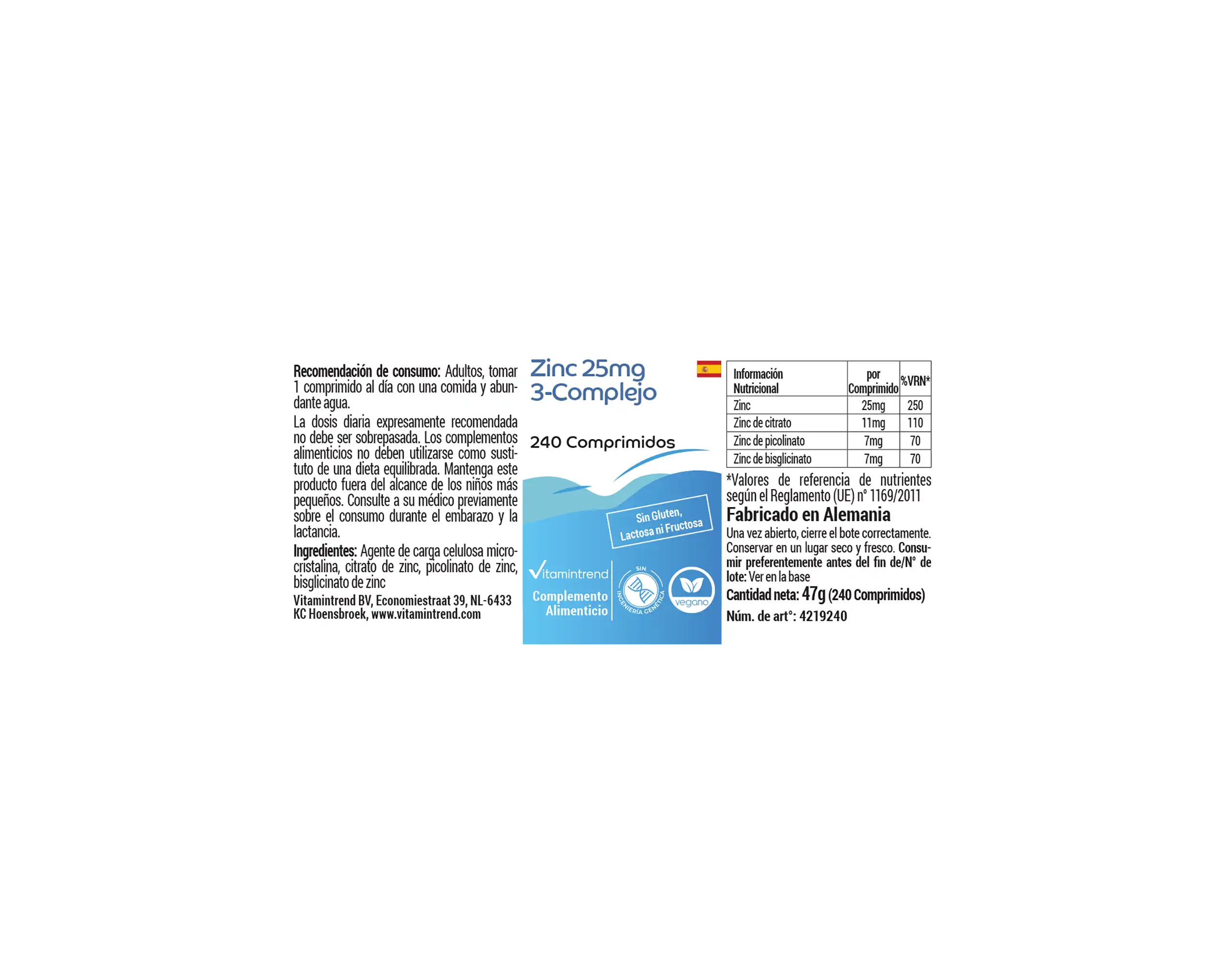 Productinformatie "Zink 25 mg 3-complex - 240 tabletten | Vitamintrend"