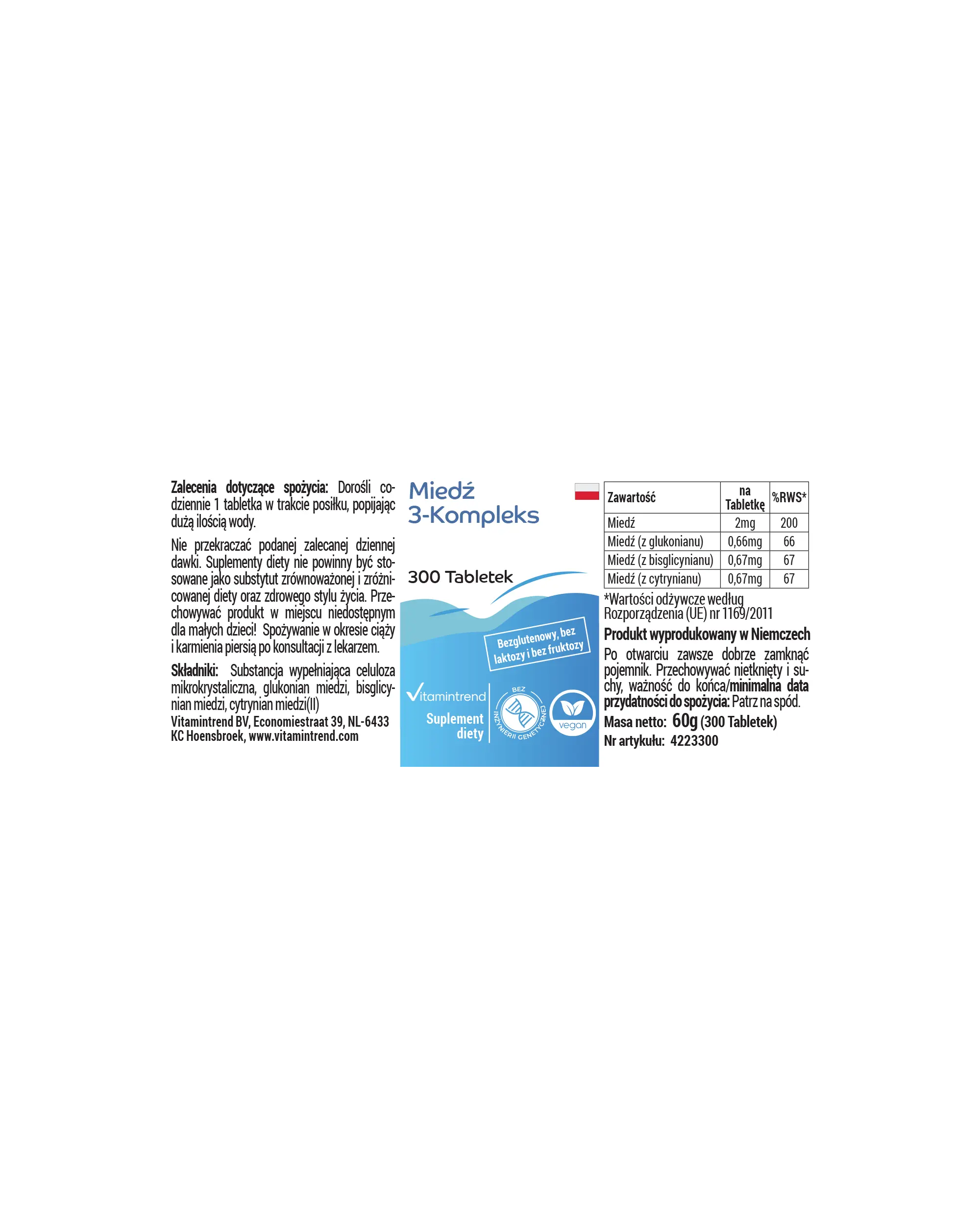 The Copper 3-Complex – 300 Tablets by Vitamintrend combines three selected copper compounds in one tablet. It contains copper gluconate, copper bisglycinate, and copper(II) citrate, which together provide a balanced formulation. Each tablet contains 2 mg of copper (200% NRV). Copper is an essential trace element that should be consumed regularly through the diet.