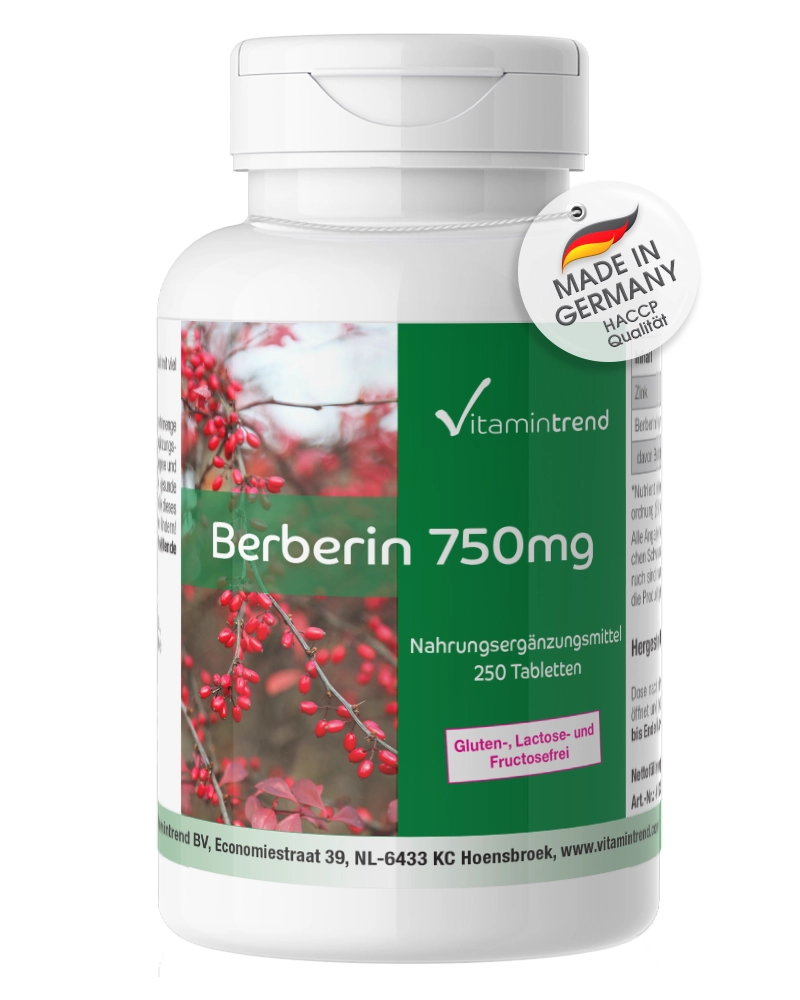 Dosage élevé 750mg de Berbérine-HCl par comprimé Normalisé à une teneur de 97% en berbérine Équivalent à 728mg de berbérine par comprimé Combiné avec du zinc Végan Sans Gluten, Lactose ni Fructose Sans Stéarate de Magnésium ni Dioxyde de Silicium Inhalt / Supplement Facts / Contenu / Información Nutricional / Contenutopro Tablette / per Tablet / par Comprimé / por Comprimido / per Compressa / per Capsula%NRV* / %VNR* / %VRN* /%VNR* Zink / Zinc / Zinco 10mg 100 Berberin Hydrochlorid / Berberine Hydrochloride / Chlorhydrate de Berbérine / Clorhidrato de Berberina / Cloridrato di Berberina / Berberinehydrochloridee 750mg - davon Berberin / of which Berberine / dont Berbérine / de los cuales Berberina / di cui Berberina / waarvan Berbers 728mg - Contient : 250 comprimésRemarque: En raison des réglementations légales, nous ne pouvons pas faire d'autres déclarations sur les effets des nutriments essentiels. Pour plus d'informations, nous vous recommandons de consulter des ouvrages spécialisés ou des sites internet dédiés. Posologie : Adultes, 1 comprimé par jour au repas avec un grand verre d'eau. Ne convient pas aux femmes enceintes et allaitantes. Un comprimé contient / VNR* : Zinc 10mg / 100% chlorhydrate de berbérine 750mg dont Berbérine 728mg VNR* : *Valeurs nutritionnelles de référence selon le règlement de l'UE (n° 1169/2011) Ingrédients : Chlorhydrate de berbérine (Berberis aristata DC., contient 97% de Berbérine), agent de charge cellulose microcristalline, citrat de zinc (contient 31,8% de zinc)