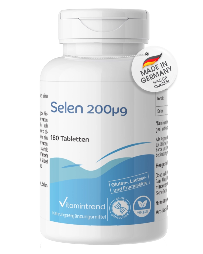 Le sélénium, un oligo-élément essentiel, est connu pour ses propriétés antioxydantes et soutient la fonction normale du système immunitaire ainsi que la fonction thyroïdienne. Notre produit vous offre une source de sélénium de haute qualité, extraite de la levure de sélénium, appréciée pour sa haute bio-disponibilité.En prenant quotidiennement ce complément, vous pouvez contribuer à protéger votre corps contre le stress oxydatif et promouvoir votre bien-être général. Investissez dans votre santé et découvrez les avantages du sélénium pour un système immunitaire fort et une fonction thyroïdienne optimale.Remarque : en raison de dispositions légales, nous ne sommes pas autorisés, en tant que fabricant de compléments alimentaires, à faire des déclarations sur les effets des substances vitales. Pour de plus amples informations, nous vous recommandons de consulter des sites Internet spécialisés ou des ouvrages de sciences naturelles avant de passer une commande chez nous.Comprimés de sélénium de Vitamintrend fortement dosés peuvent protéger les cellules et les tissus supportent le système immunitaire sans gluten, sans lactose ni fructose végétalien Contenu : 90 comprimés Conseil d'utilisation : Adultes, 1 comprimé par jour avec un repas et beaucoup d'eau.Consultez un médecin avant de consommer pendant la grossesse et l'allaitement. Un comprimé contient / VNR* : Sélénium 100μg / 182% *Valeurs nutritionnelles de référence selon le règlement (UE) n° 1169/2011 Composition : Agent de charge cellulose microcristalline, levure de sélénium (contient 0,2% de sélénium)