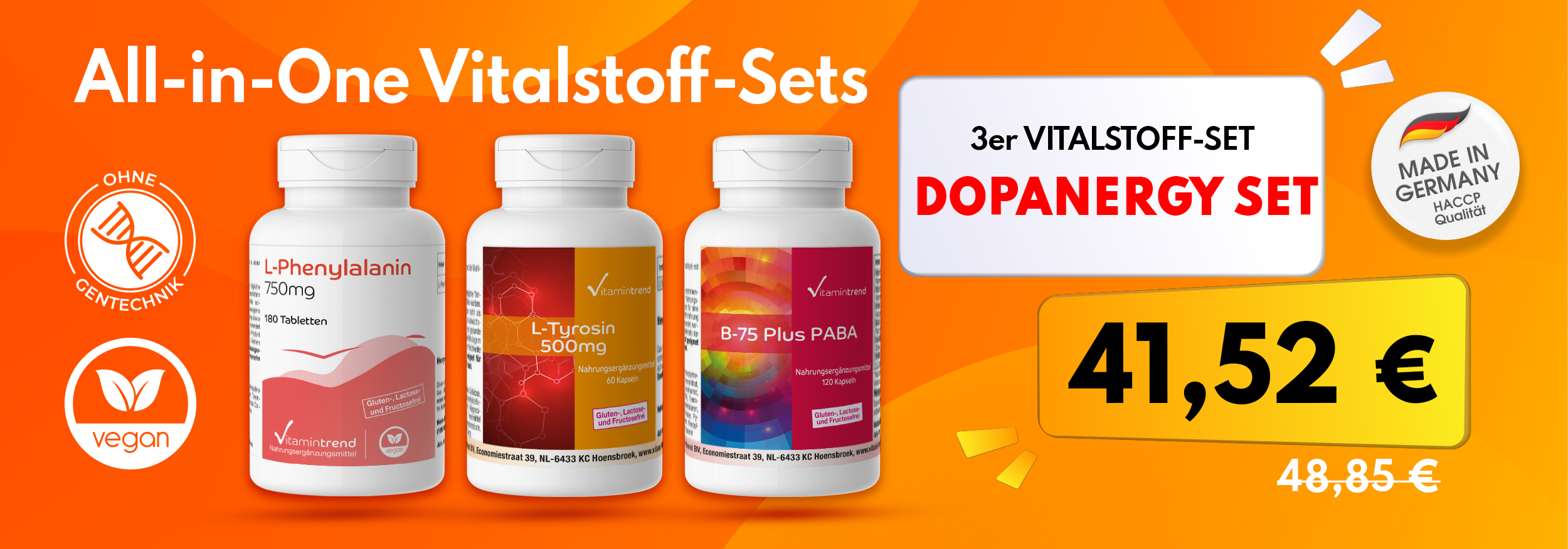 Vitamintrend bietet eine Auswahl an sorgfältig kombinierten Nahrungsergänzungsmitteln. Dieses Set enthält B-75, L-Tyrosin und L-Phenylalanin.