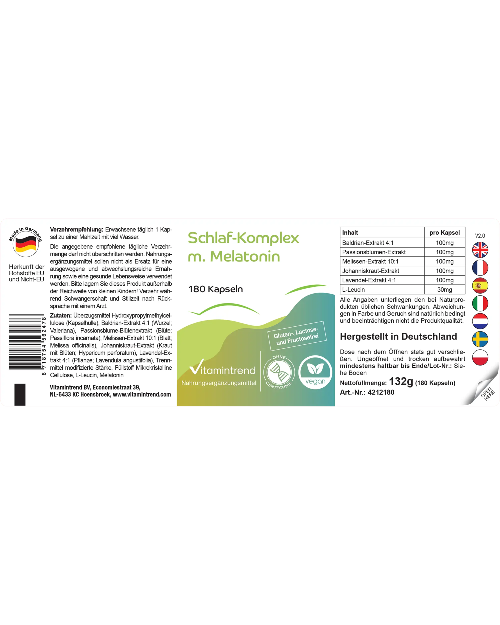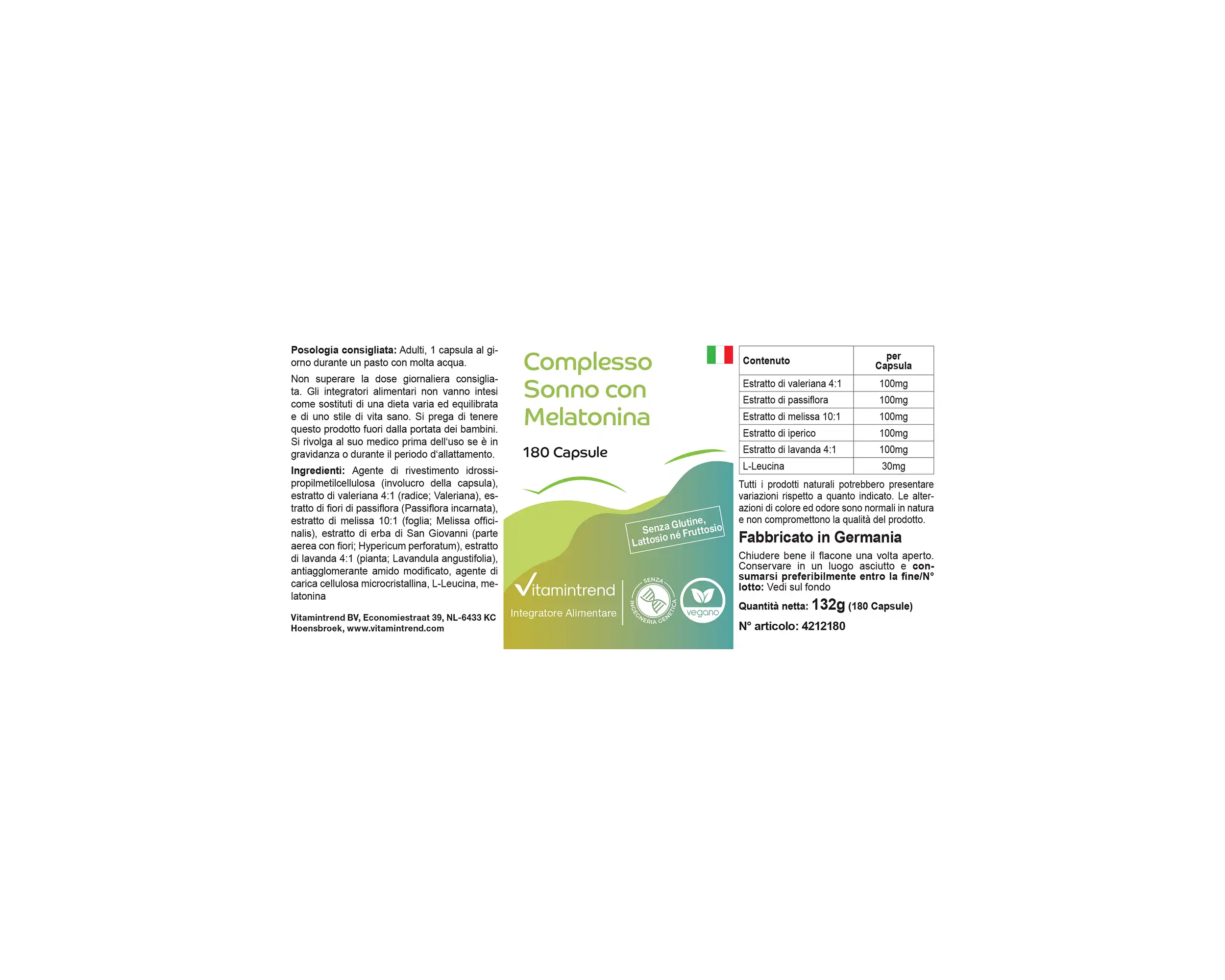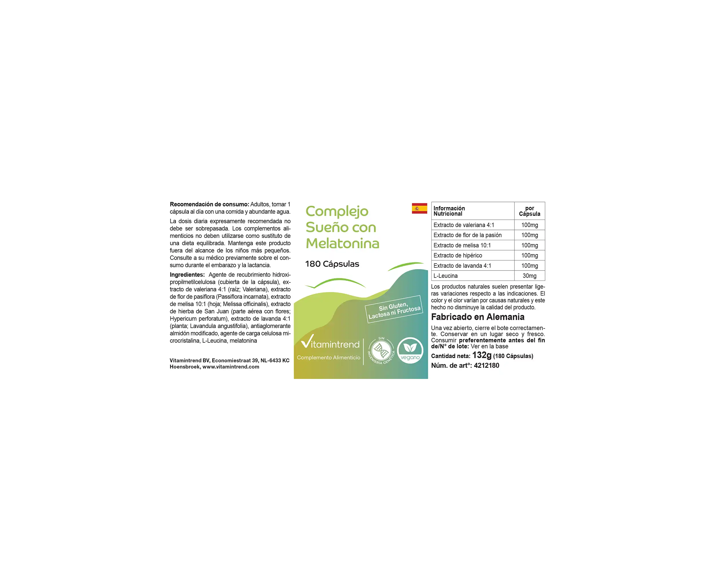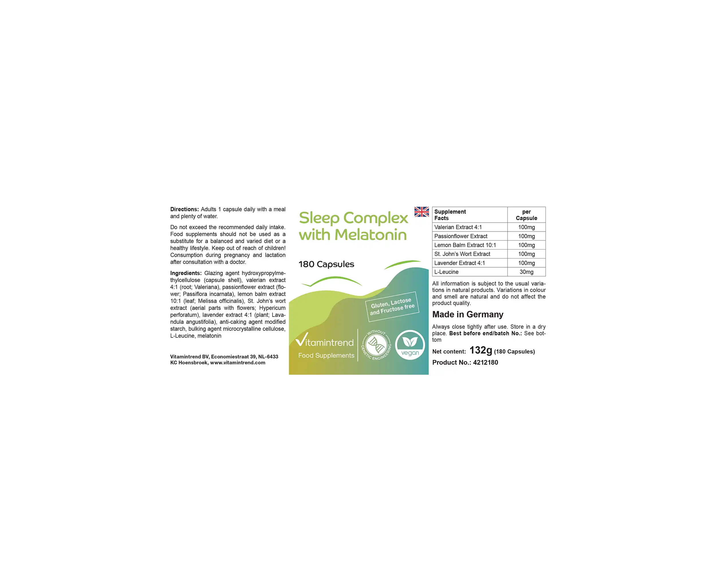 Vitamintrend Slaapcomplex met melatonine combineert bekende plantenextracten met melatonine. Elke capsule bevat een zorgvuldig uitgebalanceerde mix van valeriaan-, passiebloem-, citroenmelisse-, sint-janskruid- en lavendelextracten, evenals het essentiële aminozuur L-leucine.