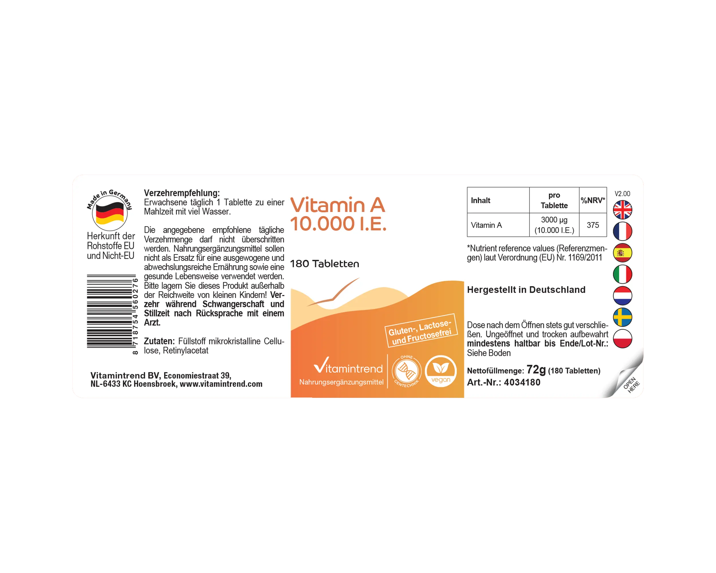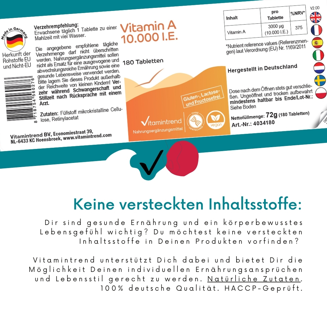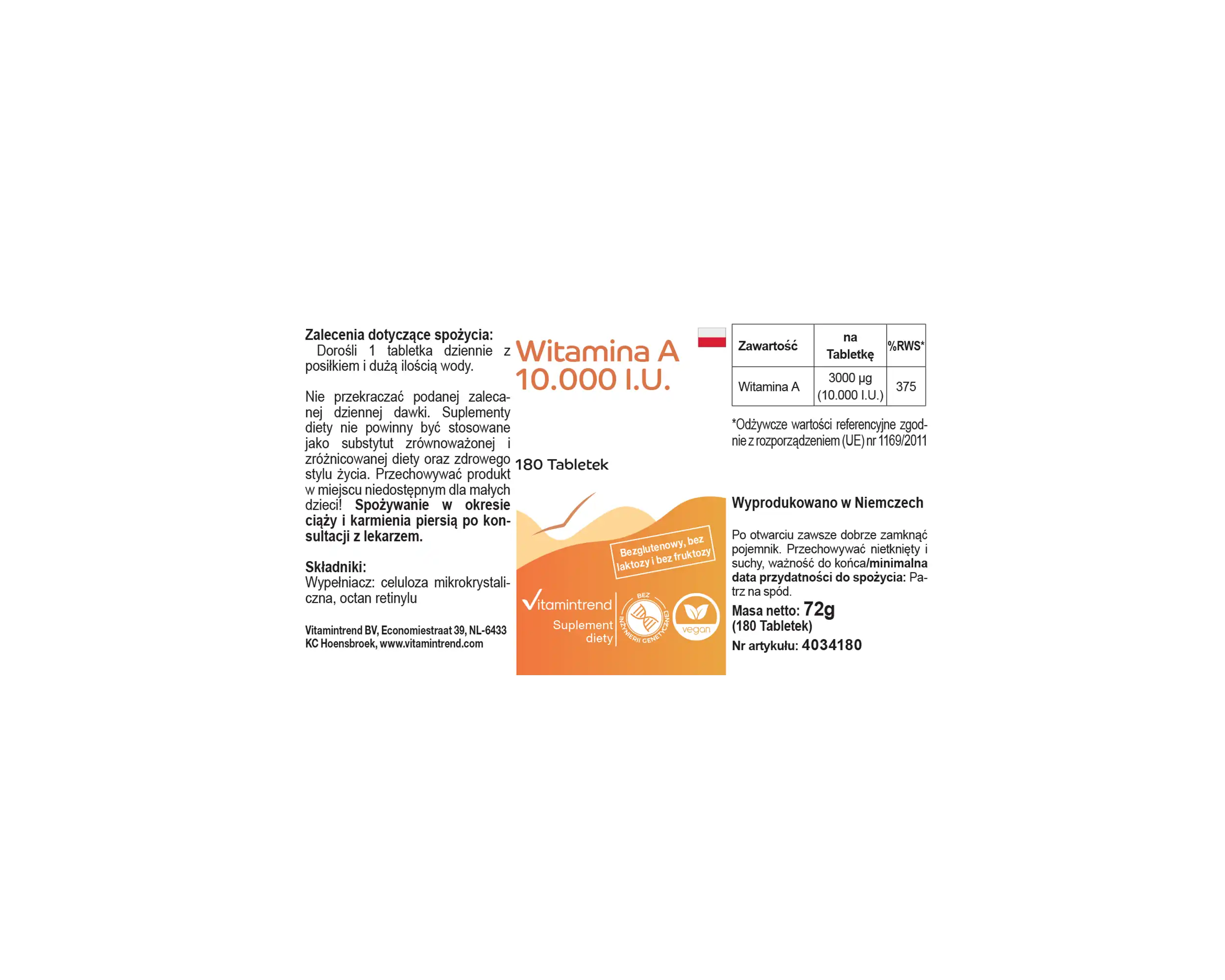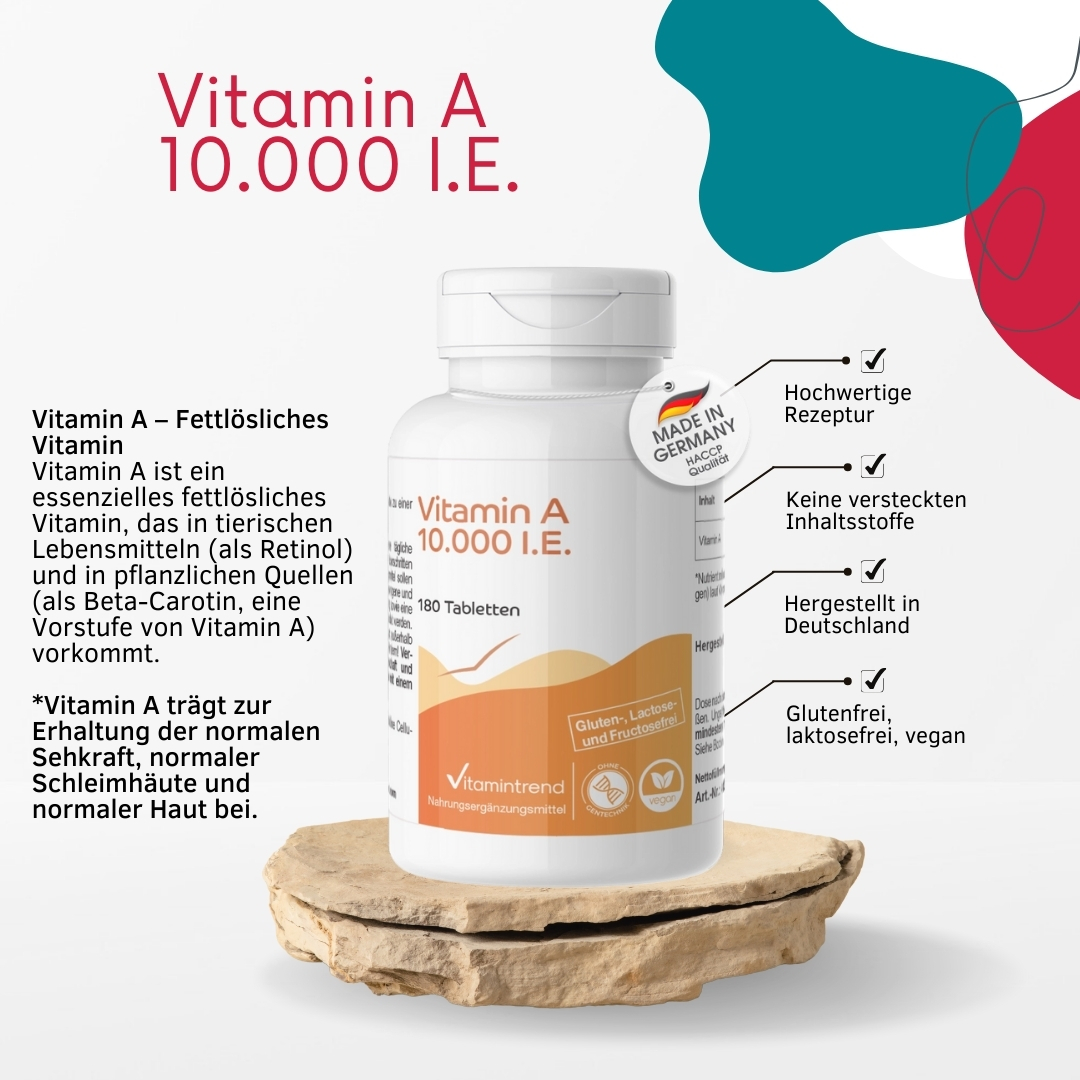Vitamine A 10.000 I.E. van Vitamintrend bevat 3000 µg retinylacetaat per tablet, wat overeenkomt met 375% van de dagelijkse referentie-inname (DRI). Vitamine A draagt onder andere bij tot het behoud van een normaal gezichtsvermogen, een normale werking van het immuunsysteem en het behoud van een gezonde huid en slijmvliezen.