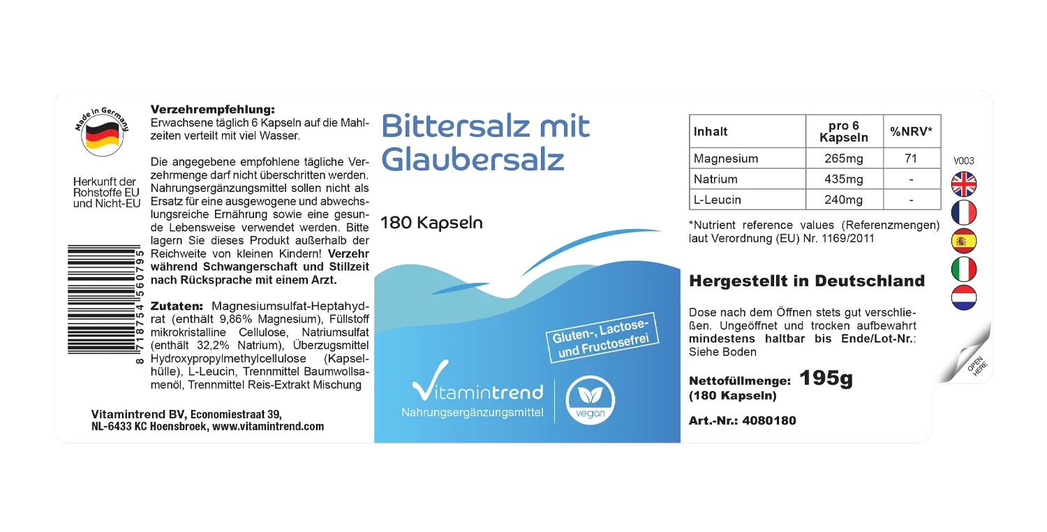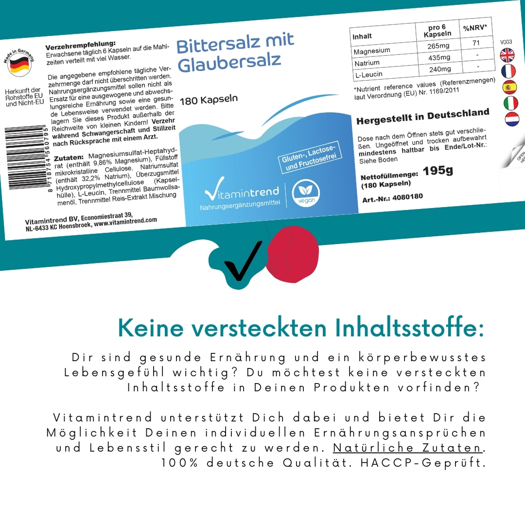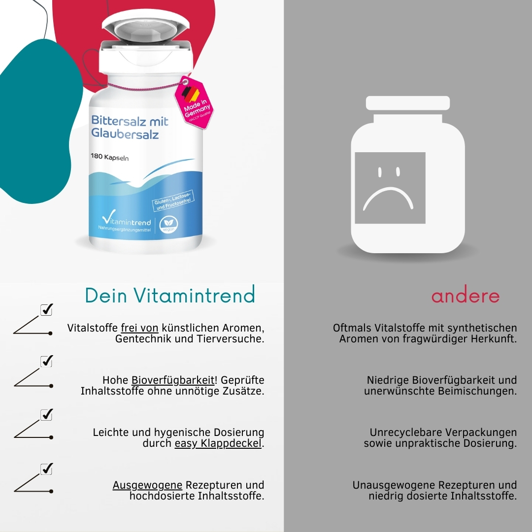 Die Kapseln von Vitamintrend enthalten eine durchdachte Kombination aus Bittersalz (Magnesiumsulfat) und Glaubersalz (Natriumsulfat) in praktischer Kapselform. Sechs Kapseln liefern 265 mg Magnesium, was 71 % des täglichen Nährstoffbezugswerts (NRV)* entspricht. Die vegane Rezeptur ist gut verträglich und frei von Farb- und Zusatzstoffen. Mit 180 Kapseln ergibt sich eine praktische 1-Monats-Versorgung.