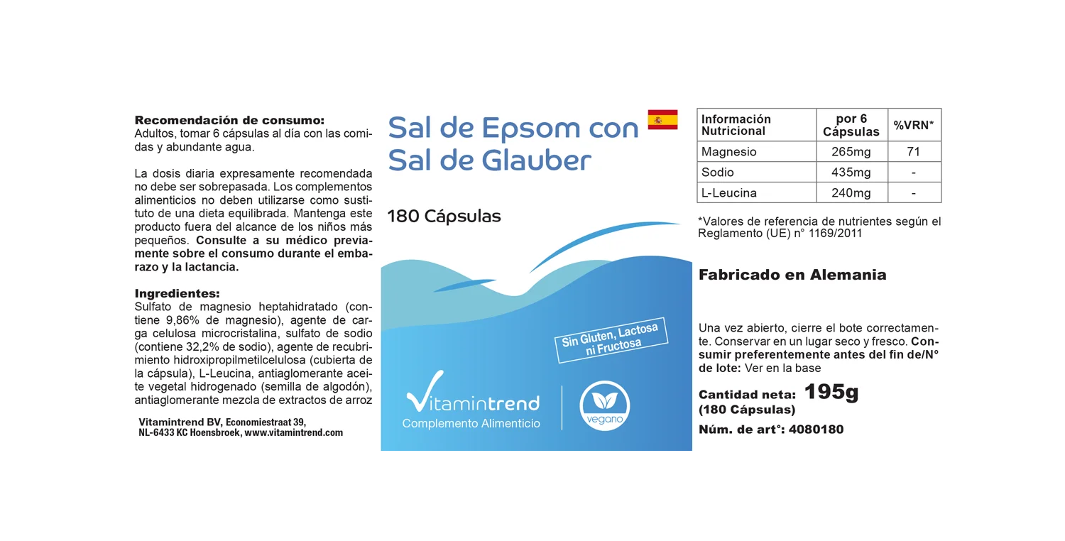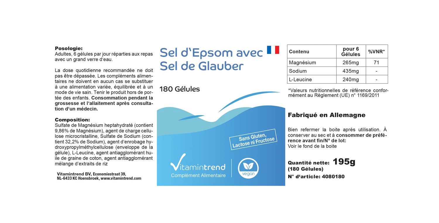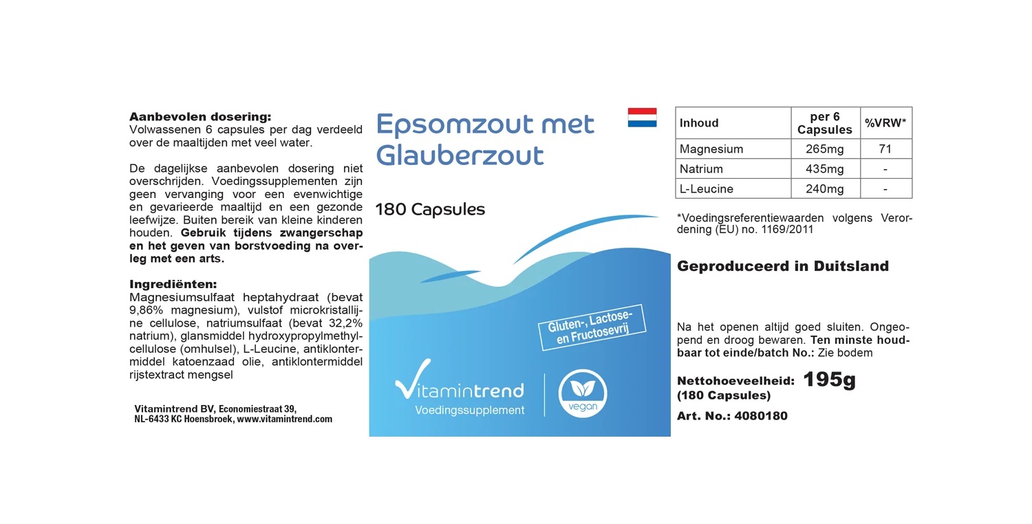 Die Kapseln von Vitamintrend enthalten eine durchdachte Kombination aus Bittersalz (Magnesiumsulfat) und Glaubersalz (Natriumsulfat) in praktischer Kapselform. Sechs Kapseln liefern 265 mg Magnesium, was 71 % des täglichen Nährstoffbezugswerts (NRV)* entspricht. Die vegane Rezeptur ist gut verträglich und frei von Farb- und Zusatzstoffen. Mit 180 Kapseln ergibt sich eine praktische 1-Monats-Versorgung.
