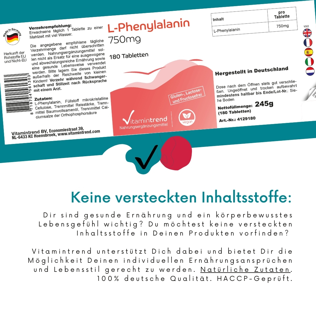 Produktinformationen "L-Phenylalanin 750mg - 180 Tabletten - hochdosiert | Vitamintrend"