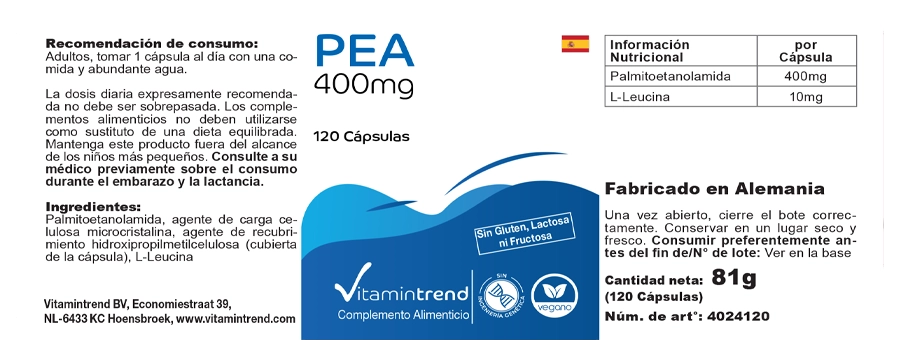 Ingredients: Palmitoylethanolamide, Bulking Agent Microcrystalline Cellulose, Glazing Agent Hydroxypropylmethylcellulose (Capsule Shell), L-Leucine