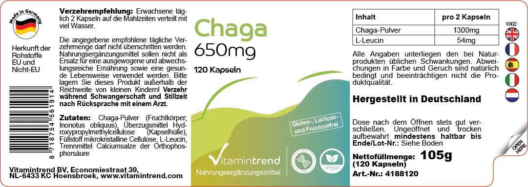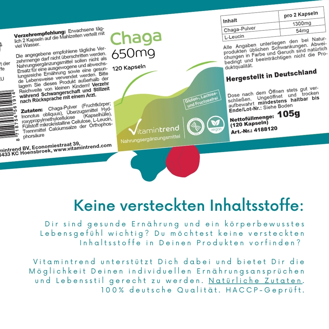Informations sur le produit "Chaga 650mg - 120 Kapseln - hochdosiert - vegan | Vitamintrend"