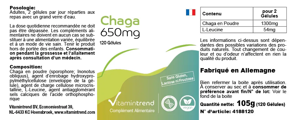 Composition : Poudre de Chaga (champignon ; Inonotus obliquus), agent d'enrobage hydroxypropylméthylcellulose (enveloppe de la gélule), agent de charge cellulose microcristalline, L-leucine, anti-agglomérant concentré de balle de riz, anti-agglomérant sels de calcium de l'acide orthophosphorique