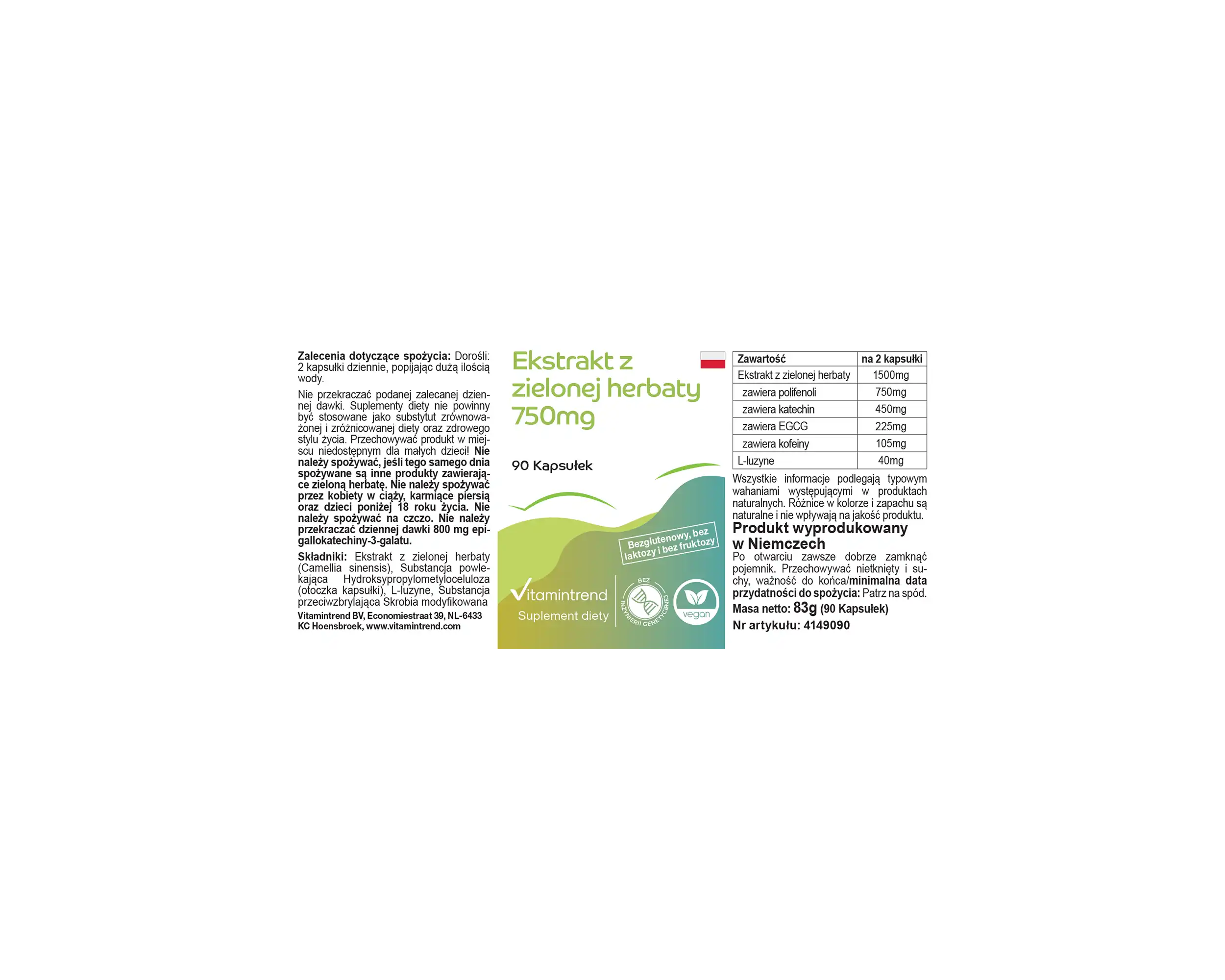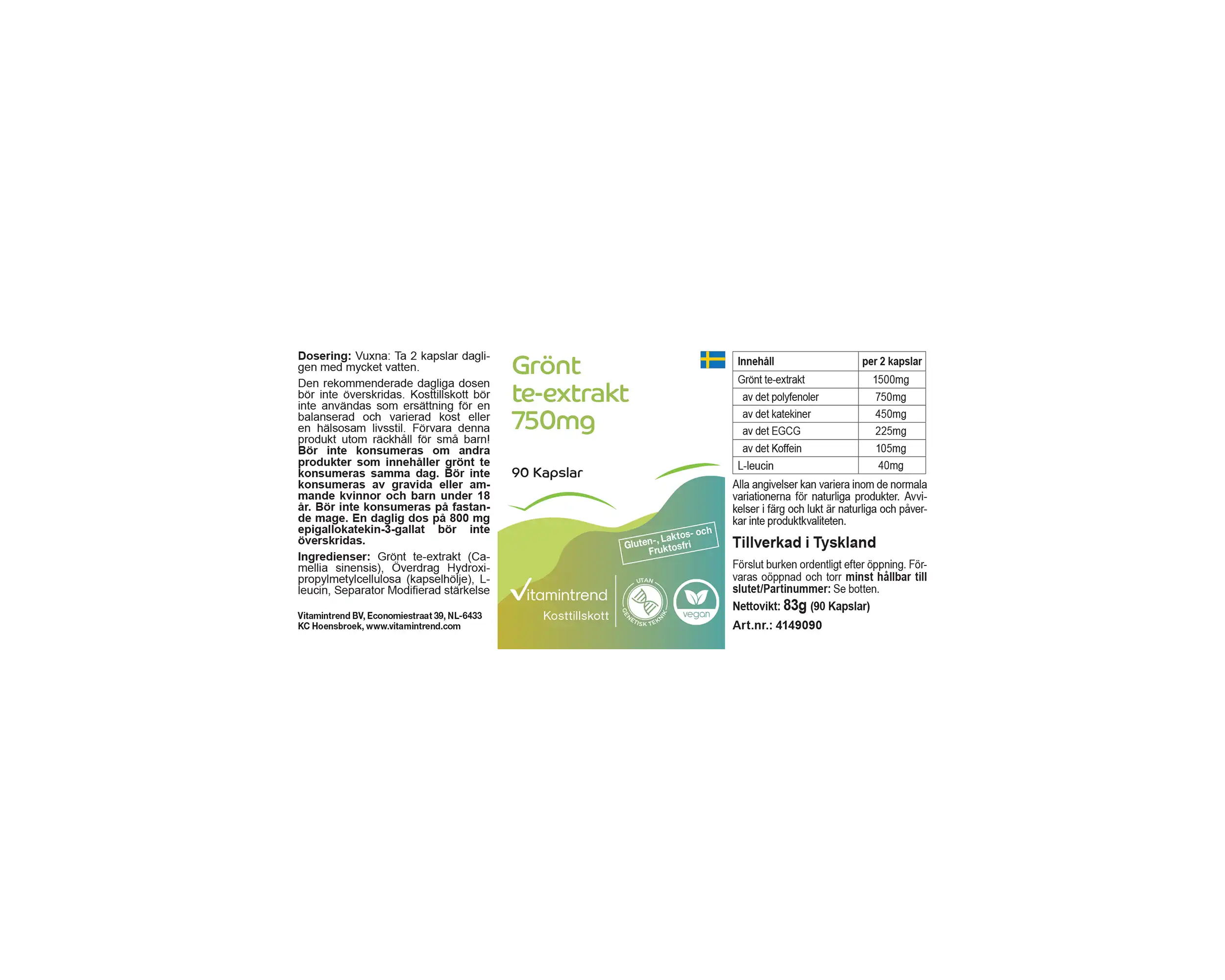 Estratto di tè verde (Camellia sinensis (L.)), 50% polifenoli, 30% catechine, 15% epigallocatechina gallato (EGCG), 7% caffeina, agente di rivestimento idrossipropilmetilcellulosa (involucro della capsula), L-leucina, agente antiagglomerante miscela di estratto di risoRaccomandazione di consumo