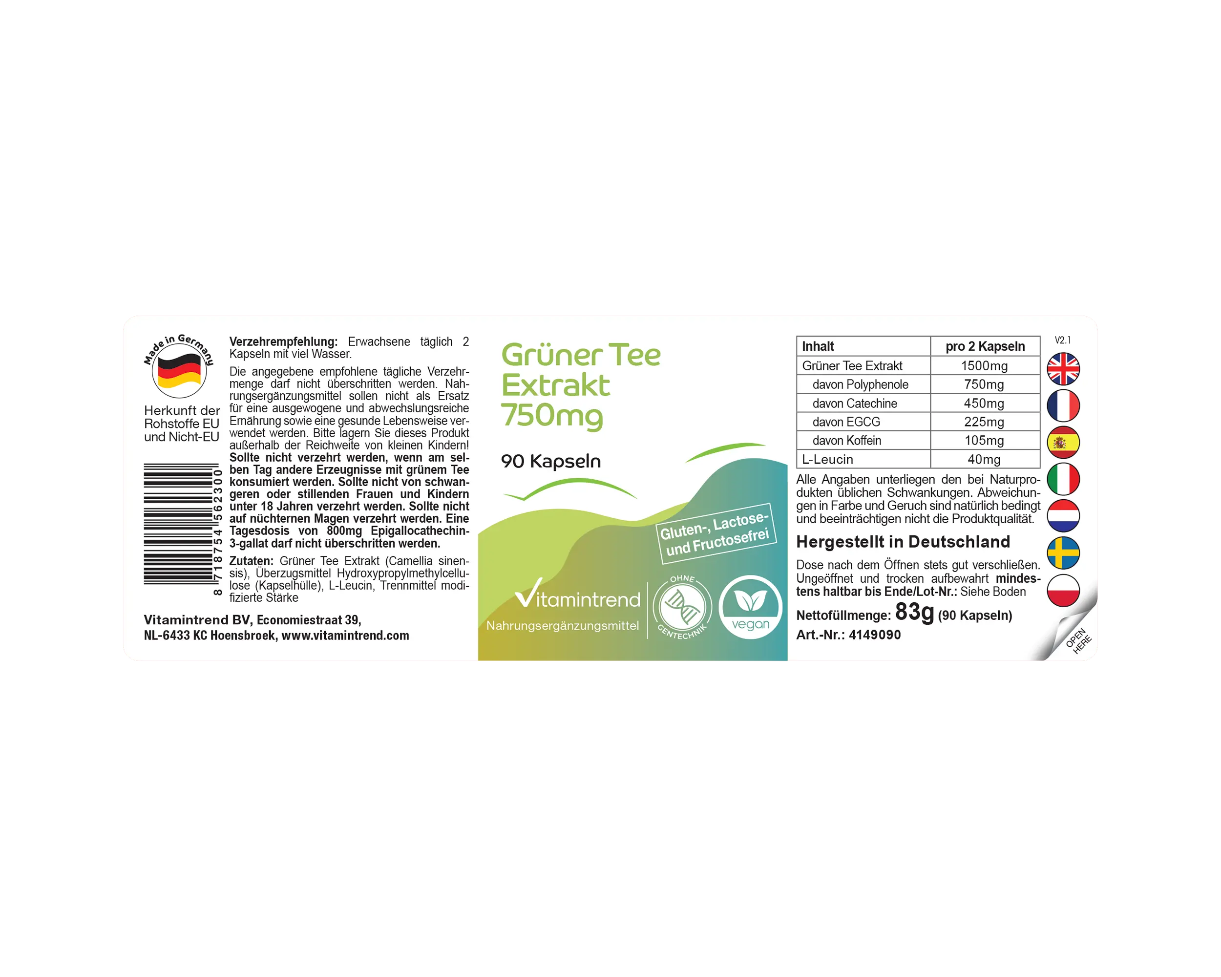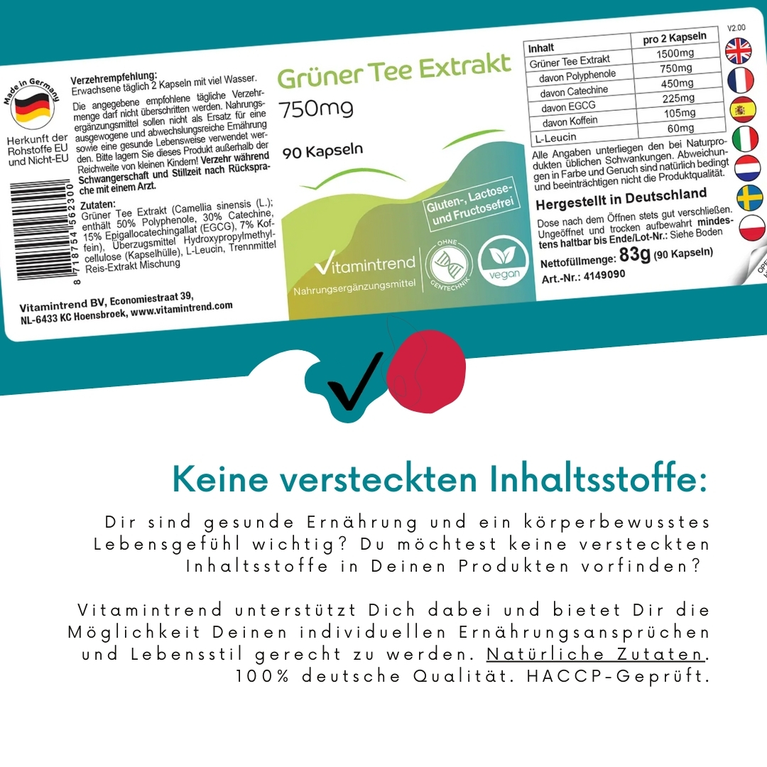 Le capsule di Vitamintrend contengono 750 mg di estratto di tè verde (Camellia sinensis) per capsula – ad alta concentrazione. L’estratto è ottenuto da foglie di tè accuratamente lavorate ed è formulato per garantire una buona tollerabilità. La formula vegana è priva di additivi inutili. Con 90 capsule, la confezione dura 1,5 mesi con assunzione giornaliera.