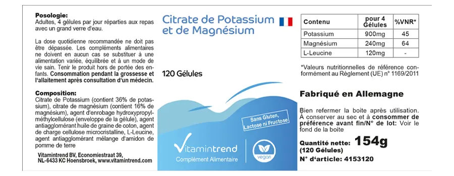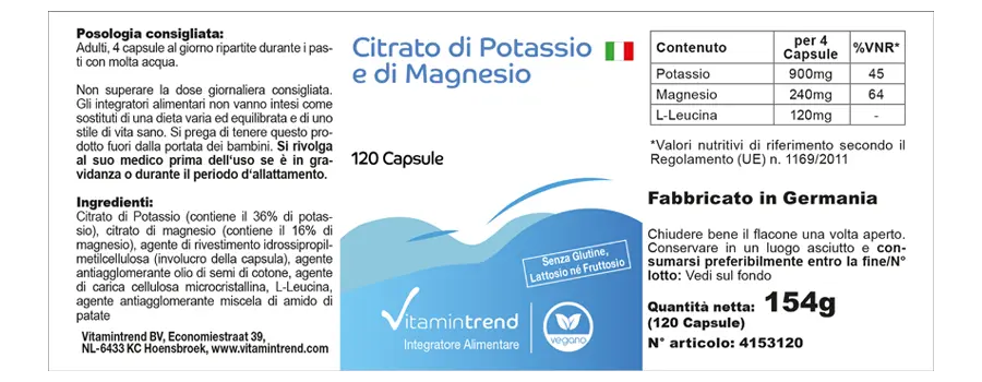 Ingredienti: Citrato di potassio (contiene il 36% di potassio), citrato di magnesio (contiene il 16% di magnesio), agente di rivestimento idrossipropilmetilcellulosa (involucro della capsula), agente antiagglomerante olio di semi di cotone, agente di carica cellulosa microcristallina, L-Leucina, agente antiagglomerante miscela di amido di patate.