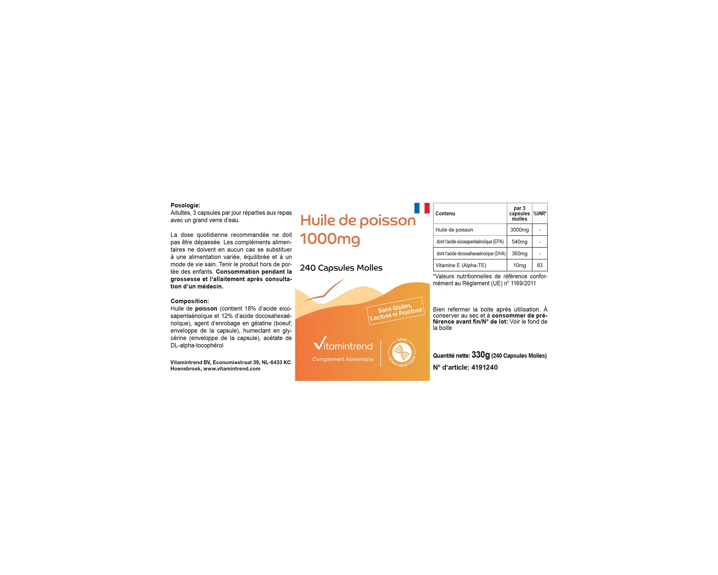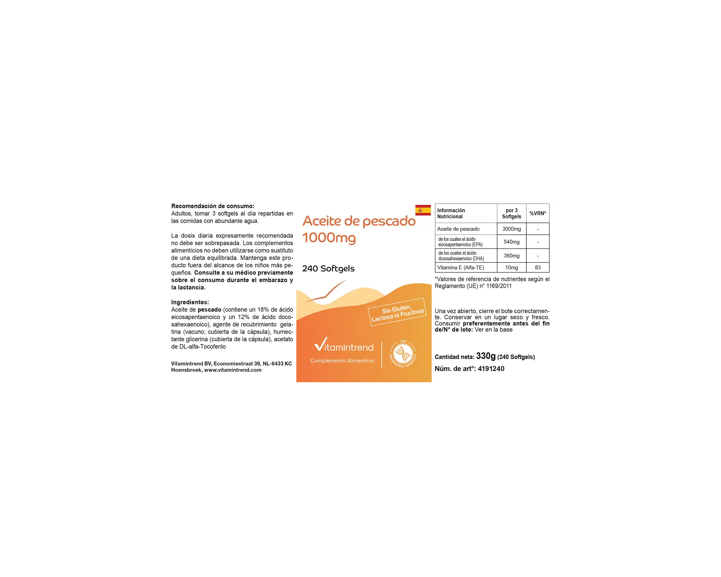Olio di Pesce 1000 mg di Vitamintrend contiene olio di pesce di alta qualità con un contenuto standardizzato di EPA (acido eicosapentaenoico) e DHA (acido docosaesaenoico). Questi acidi grassi omega-3 sono noti per il loro ruolo di supporto nelle funzioni di cuore, cervello e vista. Contiene anche vitamina E, che contribuisce a proteggere le cellule dallo stress ossidativo.