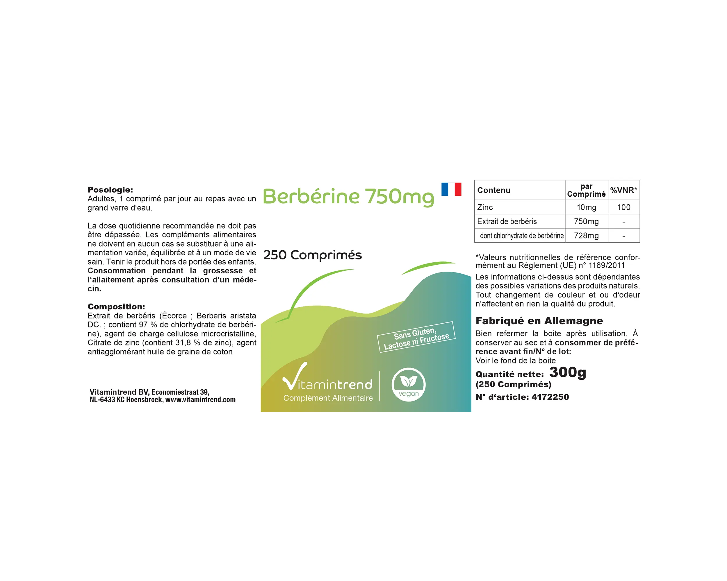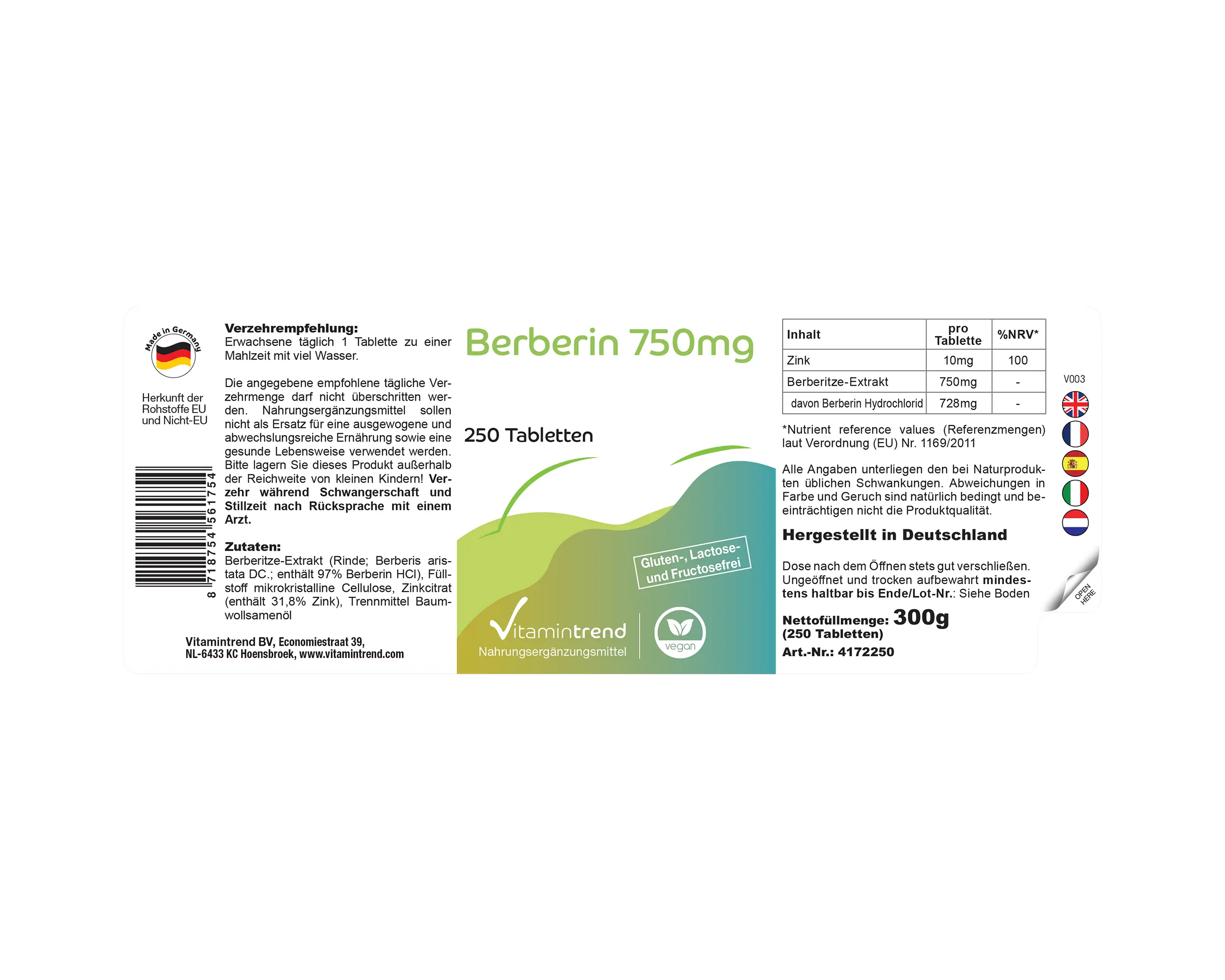 | Berberin Hydrochlorid / Berberine Hydrochloride / Chlorhydrate de Berbérine / Clorhidrato de Berberina / Cloridrato di Berberina / Berberinehydrochloridee | 750mg | - |