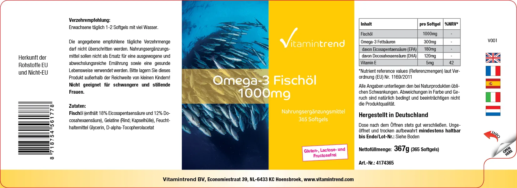 Ingredienti: Olio di pesce (contiene il 18% di acido eicosapentaenoico e il 12% di acido docosaesaenoico), gelatina (bovina; involucro della capsula), glicerolo umettante, acetato di D-alfa-tocoferile