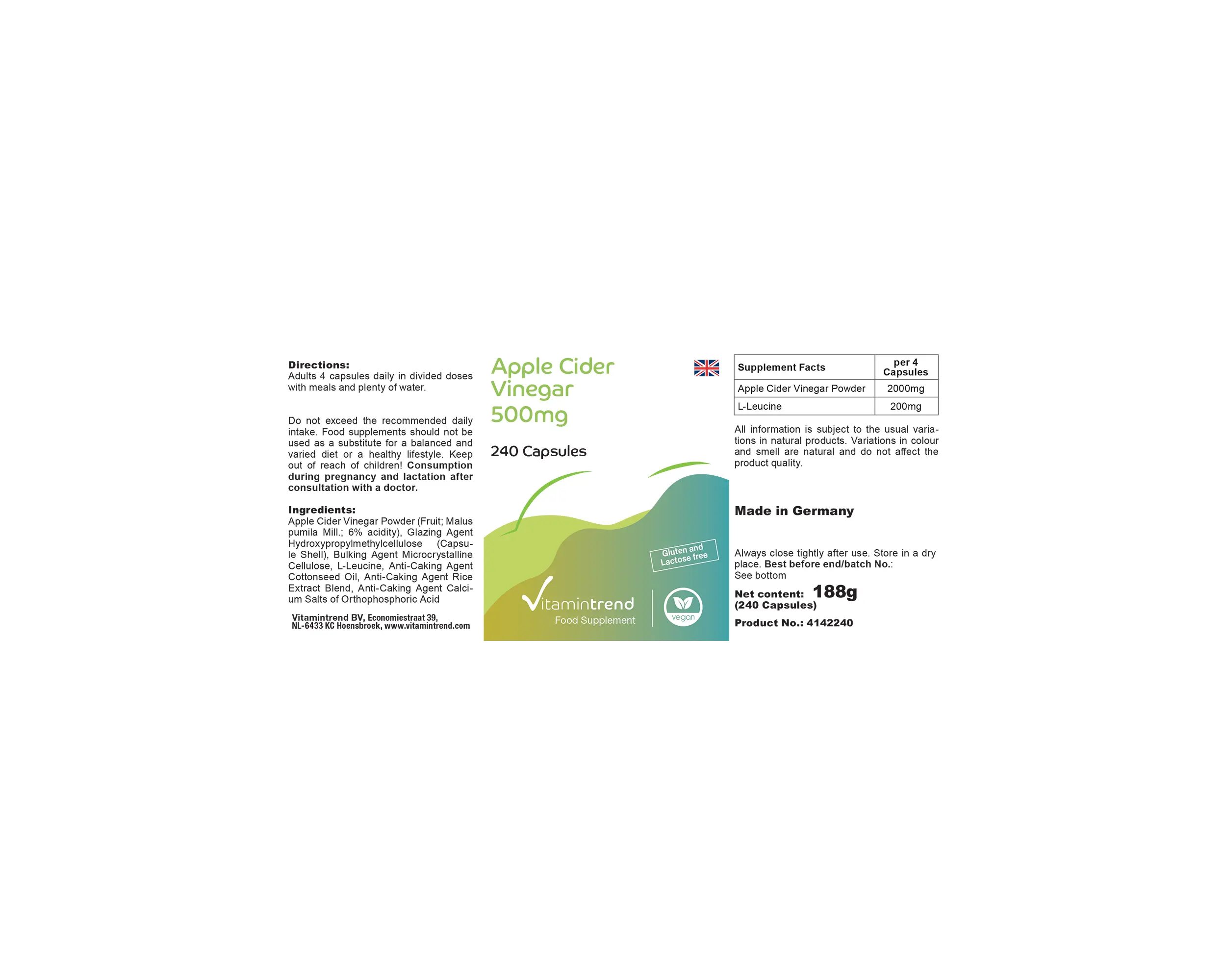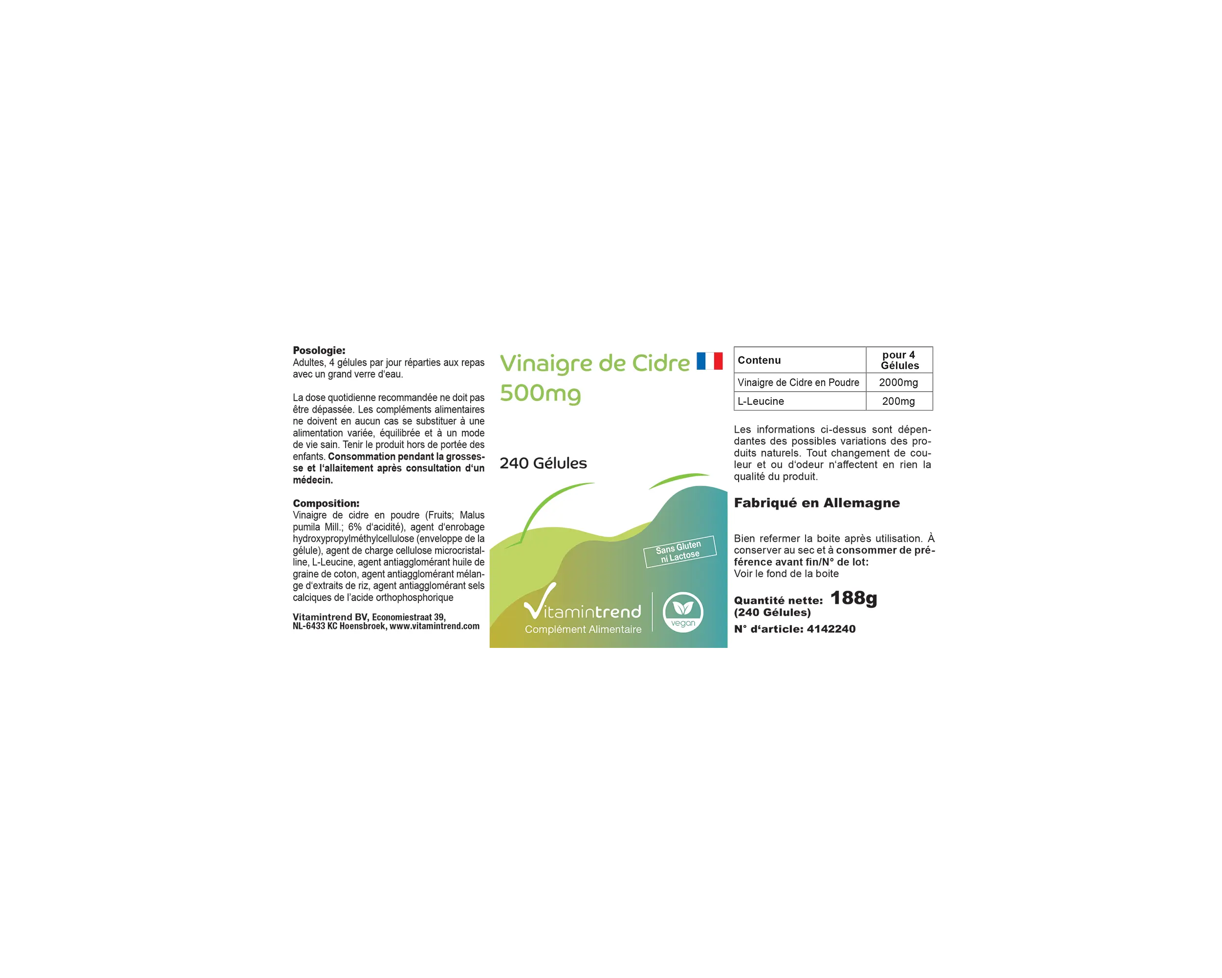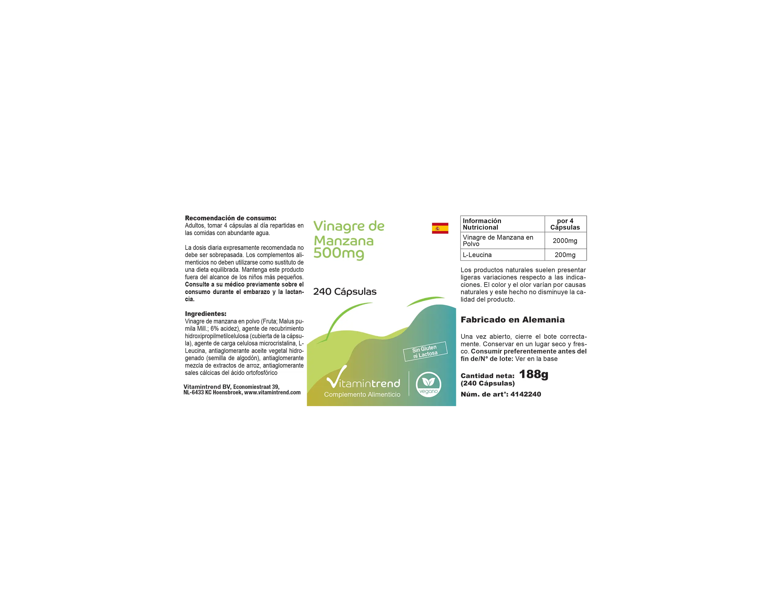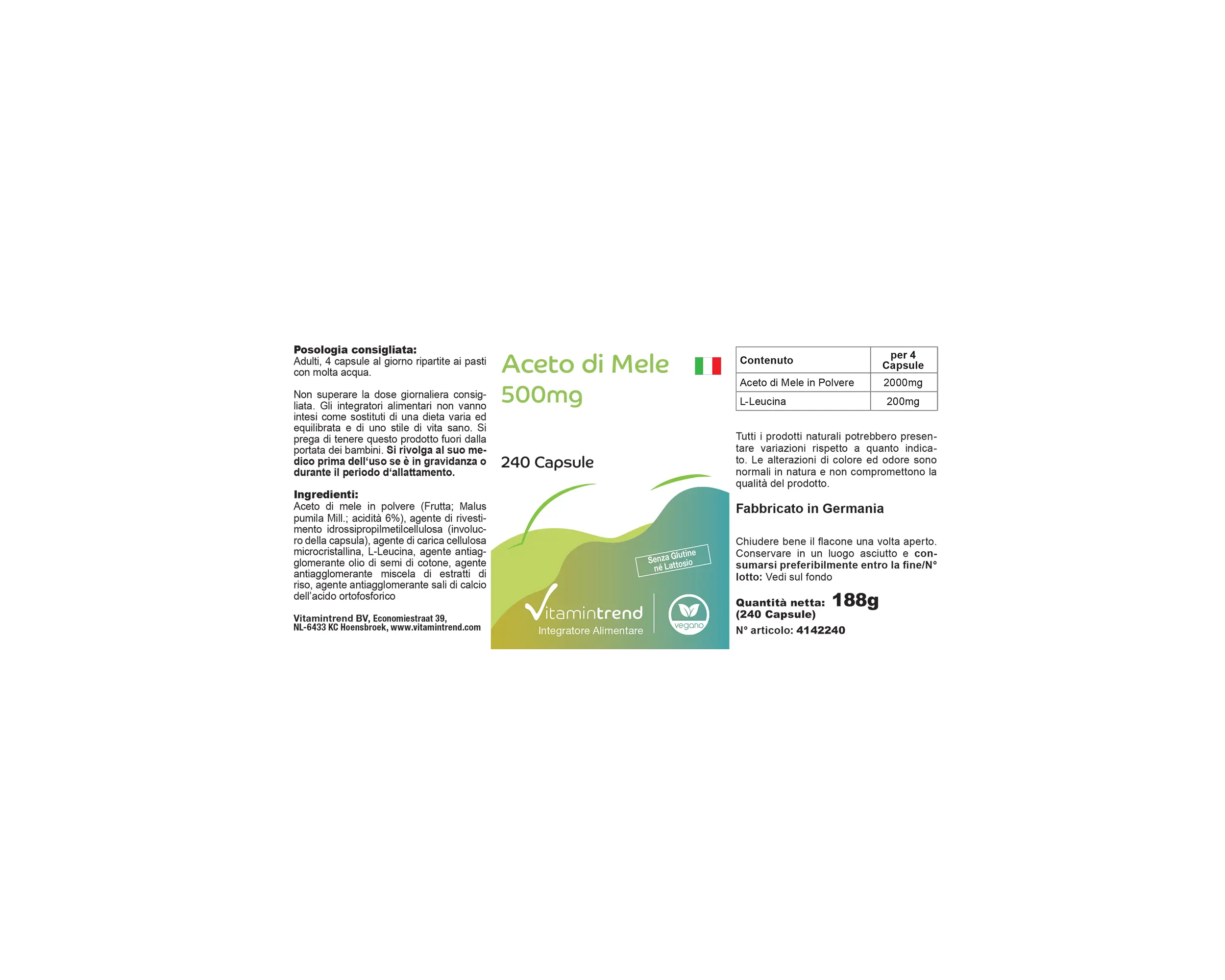 Ingredienti:Aceto di mele in polvere, agente di rivestimento idrossipropilmetilcellulosa (involucro della capsula), agente di carica cellulosa microcristallina, L-Leucina, olio di semi di cotone, miscela di estratti di riso
