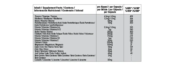 | Inhalt / Supplement Facts / Contenu / Información Nutricional / Contenuto / Inhoud | pro Kapsel / per Capsule / per Gélule / por Cápsula / pro Capsule | %NRV* / %VNR* / %VRN* / %VNR* / %VRW* |