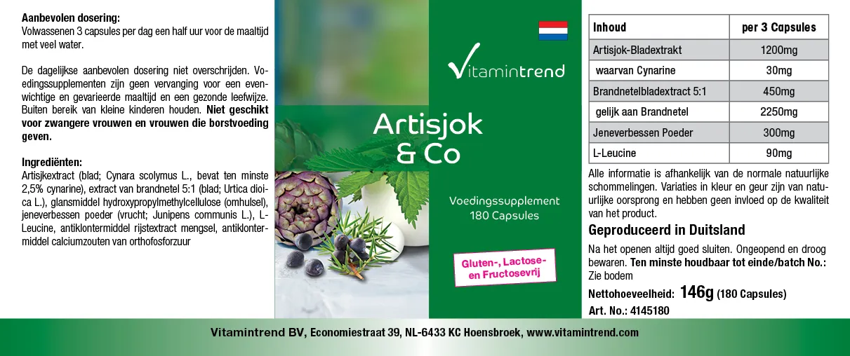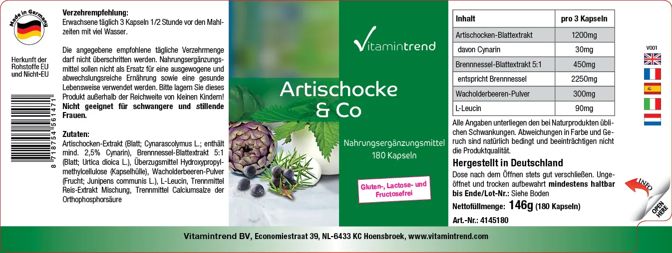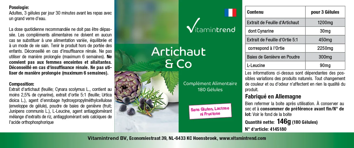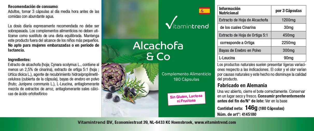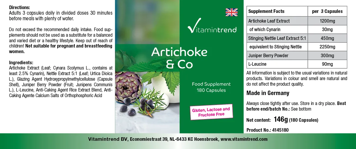 Ingredienti: Estratto di carciofo (foglia; Cynarascolymus L.; contiene almeno il 2,5% di cinarina), estratto di ortica 5:1 (foglia; Urtica dioica L.), agente di rivestimento idrossipropilmetilcellulosa (involucro della capsula), bacche di ginepro in polvere (frutto; Junipens communis L.), L-leucina, miscela di estratti di riso, sali di calcio dell’acido ortofosforico
