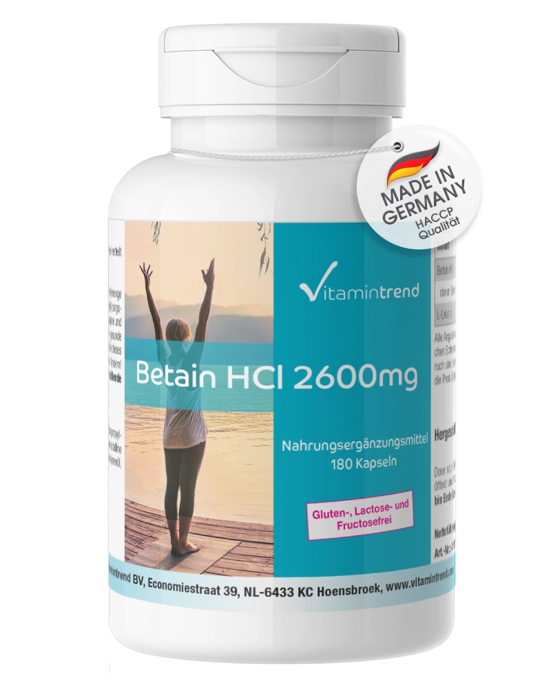 Das Betain-HCl von Vitamintrend liefert 650 mg Betainhydrochlorid pro Kapsel. Bei einer täglichen Einnahme von 4 Kapseln entspricht das einer Gesamtmenge von 2600 mg Betain-HCl. Die Kapseln sind vegan, leicht zu schlucken und frei von Zusatzstoffen. Mit 180 Kapseln enthält jede Dose einen Vorrat für 45 Tage. Betain trägt bei zu: ✔ einem normalen Homocystein-Stoffwechsel (ab 1,5 g Betain täglich) Betain-HCl von Vitamintrend ohne Zusatz – Made in Germany ✔ Ohne Zusatz- und Farbstoffe ✔ Hochwertige Nahrungsergänzungsmittel ✔ Hergestellt in Deutschland ✔ Produziert nach Qualitäts- und Hygienestandards HACCP Vitalstoffe von Vitamintrend ohne Zusatz – Made in Germany ✔ Hochdosiert ✔ 100 % Vegan ✔ Ohne Zusatz- und Farbstoffe ✔ Hochwertige Nahrungsergänzungsmittel ✔ Hergestellt in Deutschland ✔ Produziert nach Qualitäts- und Hygienestandards HACCP Hinweis: Aufgrund rechtlicher Bestimmungen dürfen wir als Hersteller von Nahrungsergänzungsmitteln keine Aussagen zur Wirkung von Vitalstoffen machen. Für weiterführende Informationen empfehlen wir dir, dich auf spezialisierten Websites oder in naturkundlicher Fachliteratur zu informieren, bevor du eine Bestellung bei uns aufgibst.