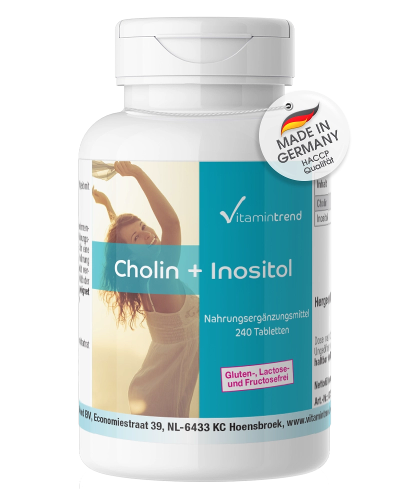 Die Tabletten von Vitamintrend enthalten pro Tagesportion 100 mg Cholin und 250 mg Inositol in hochwertiger, rein veganer Qualität. Die Kombination aus diesen zwei wichtigen Mikronährstoffen ist frei von Zusatz- und Farbstoffen. Mit 240 Tabletten bietet die Packung eine komfortable 8-Monats-Versorgung bei täglicher Einnahme. Cholin trägt bei zu: ✔ normalem Fettstoffwechsel ✔ Erhaltung normaler Leberfunktion ✔ normalem Homocystein-Stoffwechsel Cholin + Inositol von Vitamintrend ohne Zusatz – Made in Germany ✔ Ohne Zusatz- und Farbstoffe ✔ Hochwertige Nahrungsergänzungsmittel ✔ Hergestellt in Deutschland ✔ Produziert nach Qualitäts- und Hygienestandards HACCP Vitalstoffe von Vitamintrend ohne Zusatz – Made in Germany ✔ Hochdosiert ✔ 100 % Vegan ✔ Ohne Zusatz- und Farbstoffe ✔ Hochwertige Nahrungsergänzungsmittel ✔ Hergestellt in Deutschland ✔ Produziert nach Qualitäts- und Hygienestandards HACCP Hinweis: Aufgrund rechtlicher Bestimmungen dürfen wir als Hersteller von Nahrungsergänzungsmitteln keine Aussagen zur Wirkung von Pflanzen- oder Mikronährstoffen machen. Für weiterführende Informationen empfehlen wir dir, dich auf spezialisierten Websites oder in naturkundlicher Fachliteratur zu informieren, bevor du eine Bestellung bei uns aufgibst.