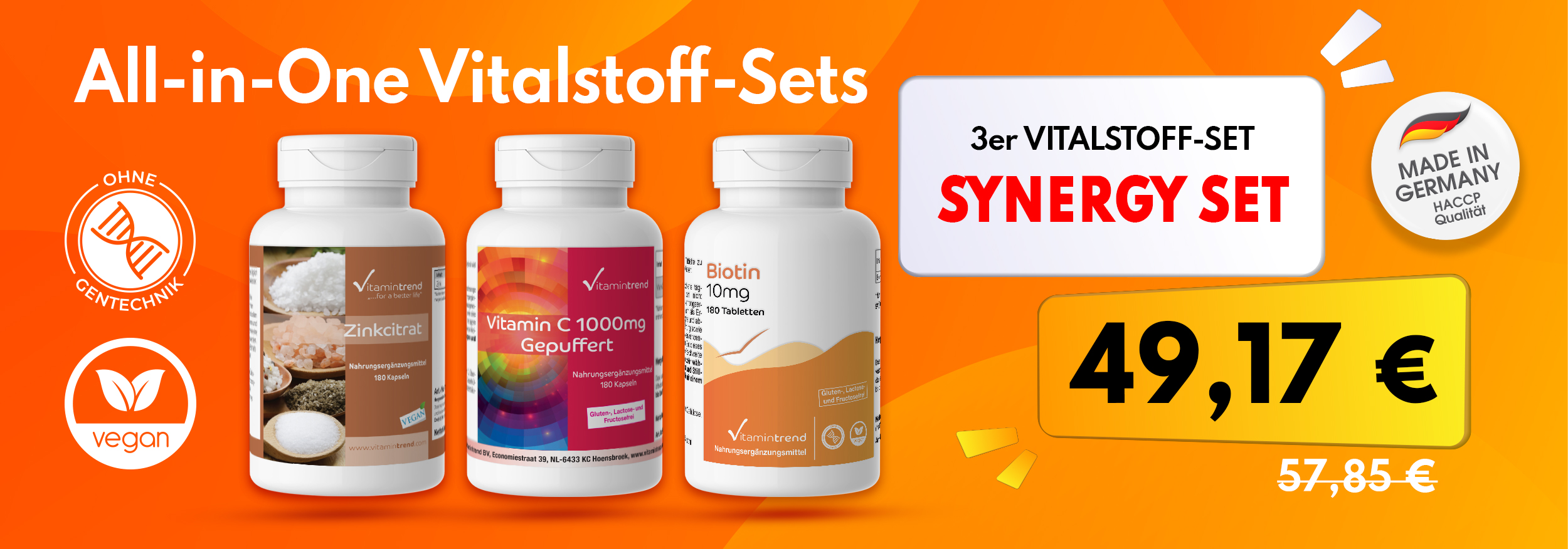Immun-Synergy Vitamine von Vitamintrend sind hochwertige Nahrungsergänzungsmittel, die speziell zur Unterstützung des Immunsystems entwickelt wurden. Dieses Set enthält Zink und Vitamin C, zwei essenzielle Nährstoffe, die eine entscheidende Rolle bei der Stärkung der Immunabwehr spielen.