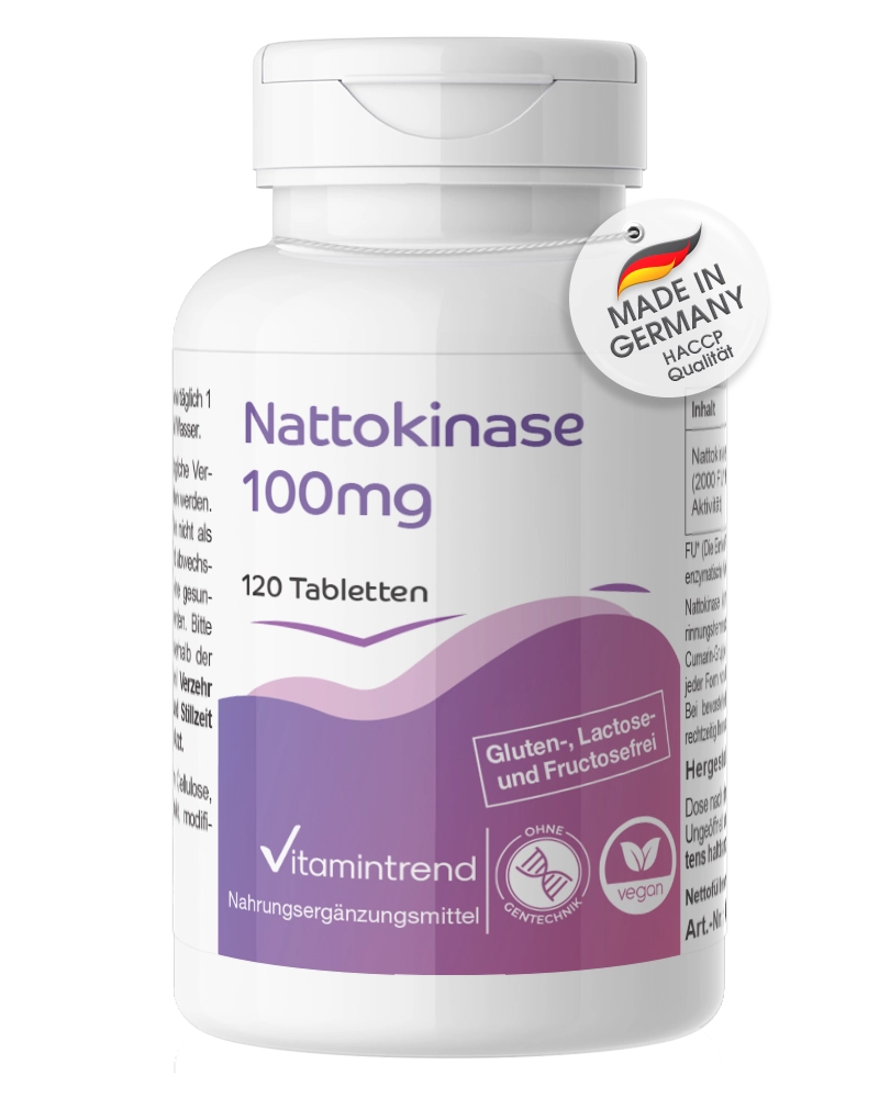 Die Nattokinase Tabletten von Vitamintrend enthalten täglich 2000 FU Nattokinase aus 100 mg fermentiertem Sojabohnen-Extrakt. Mit 120 Tabletten bietet die Großpackung eine praktische 4-Monats-Versorgung. Das Produkt ist vegan sowie frei von Farb- und Zusatzstoffen. Nattokinase von Vitamintrend – Made in Germany ✔ 2000 FU Nattokinase pro Tagesverzehr ✔ 100 mg fermentierter Sojabohnen-Extrakt ✔ Ohne Zusatz- und Farbstoffe ✔ Hergestellt in Deutschland ✔ Produziert nach Qualitäts- und Hygienestandards HACCP Vitalstoffe von Vitamintrend ohne Zusatz – Made in Germany ✔ Hochdosiert ✔ 100 % Vegan ✔ Ohne Zusatz- und Farbstoffe ✔ Hochwertige Nahrungsergänzungsmittel ✔ Hergestellt in Deutschland ✔ Produziert nach Qualitäts- und Hygienestandards HACCP Hinweis: Aufgrund rechtlicher Bestimmungen dürfen wir als Hersteller von Nahrungsergänzungsmitteln keine Aussagen zur Wirkung von Enzymen oder Pflanzenextrakten machen. Für weiterführende Informationen empfehlen wir dir, dich auf spezialisierten Websites oder in naturkundlicher Fachliteratur zu informieren, bevor du eine Bestellung bei uns aufgibst.