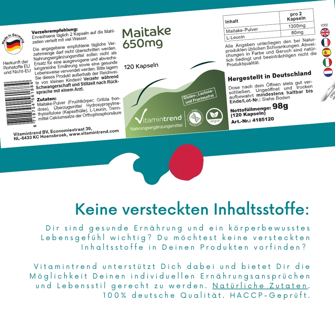 Produktinformationen "Maitake 650mg - 120 Kapseln - Adaptogen - hochdosiert - vegan | Vitamintrend"