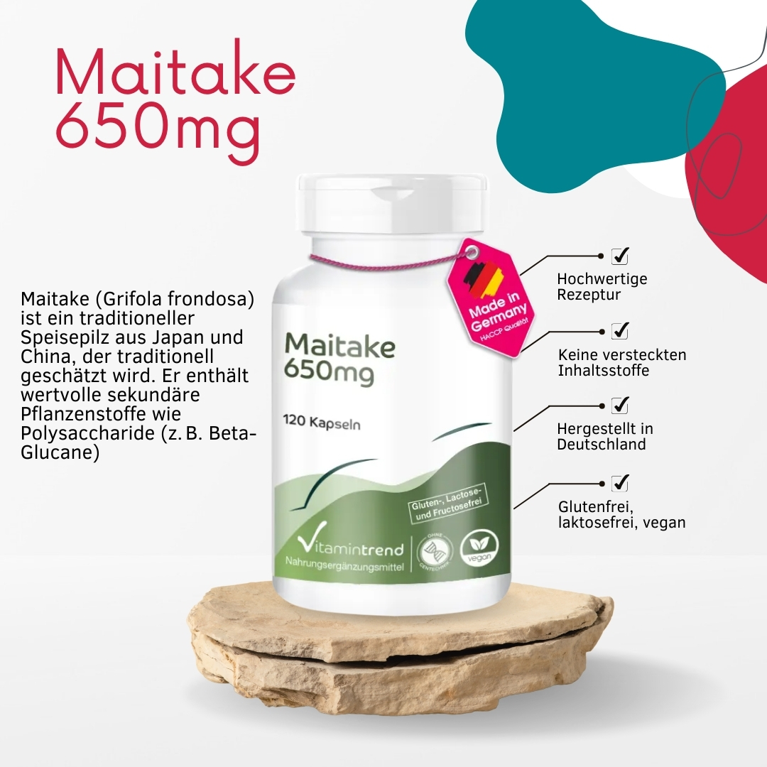 Das Maitake 650 mg von Vitamintrend enthält hochwertiges Maitake-Pulver aus dem Fruchtkörper des Vitalpilzes Grifola frondosa. Dieser Pilz ist besonders reich an Polysacchariden (Glucanen), Lektinen und Nukleinsäure-Vorstufen, was ihn zu einer wertvollen Ergänzung für die tägliche Ernährung macht. Bemerkenswert ist auch der hohe Anteil an Ergosterin, einer Vorstufe des Vitamin D.
