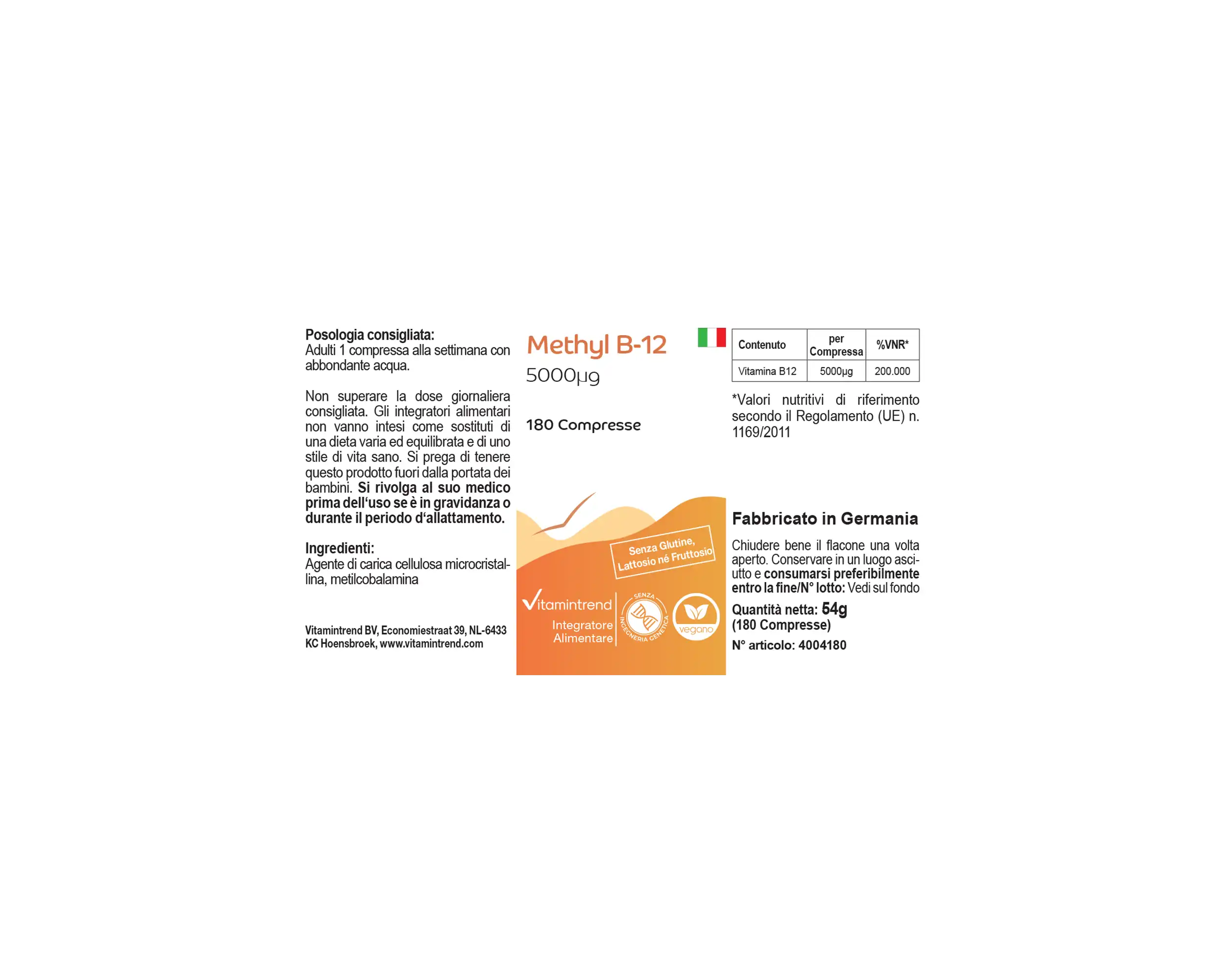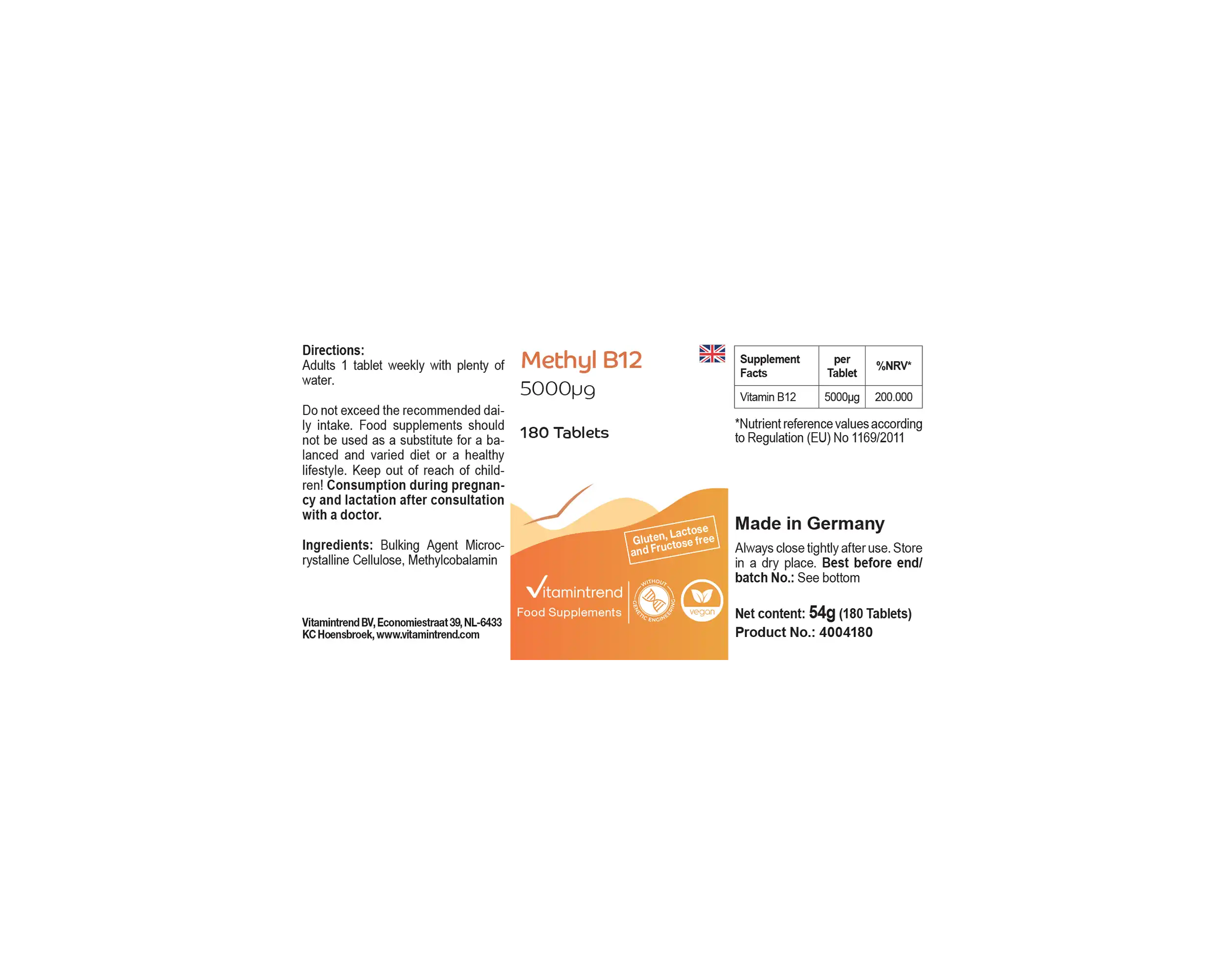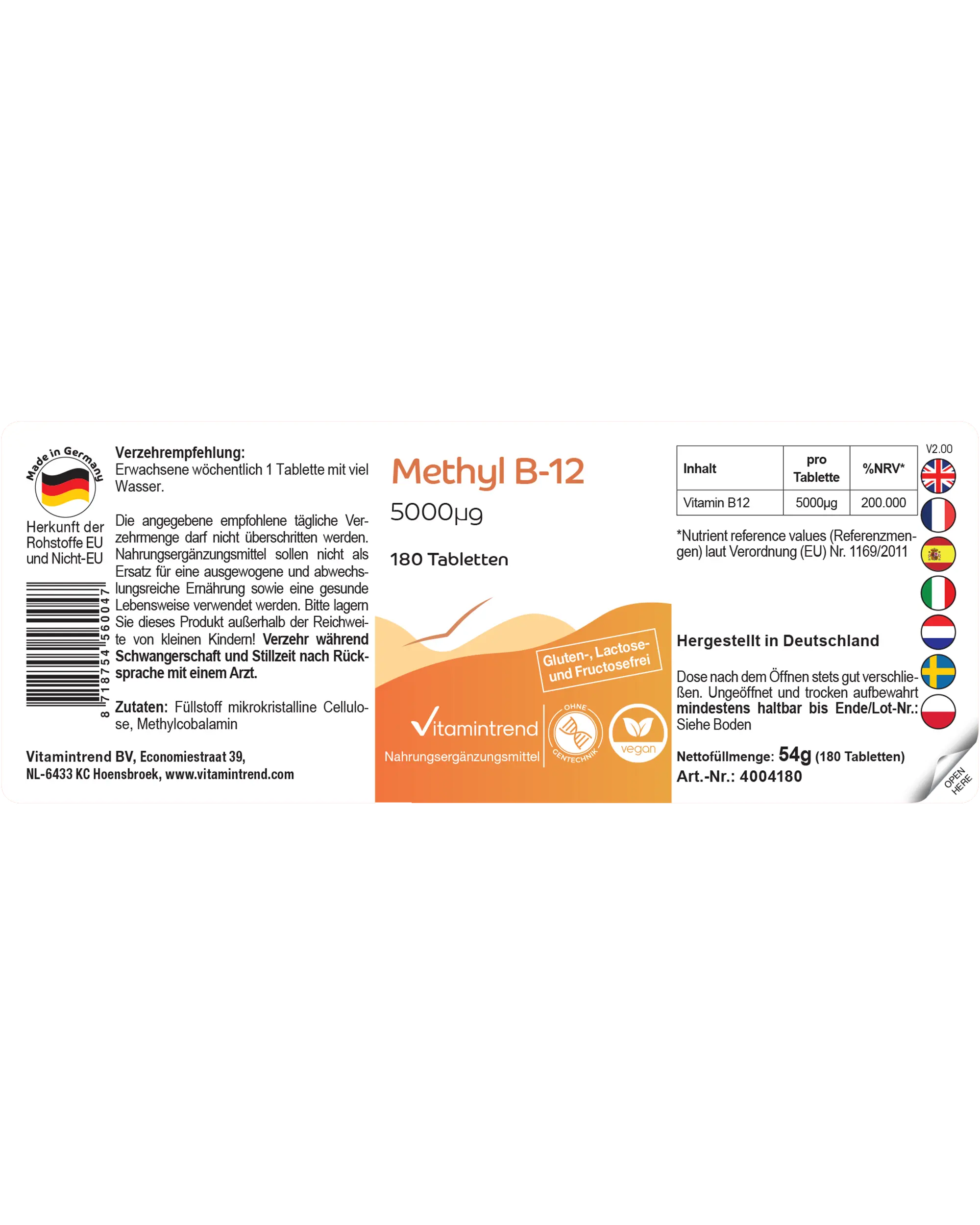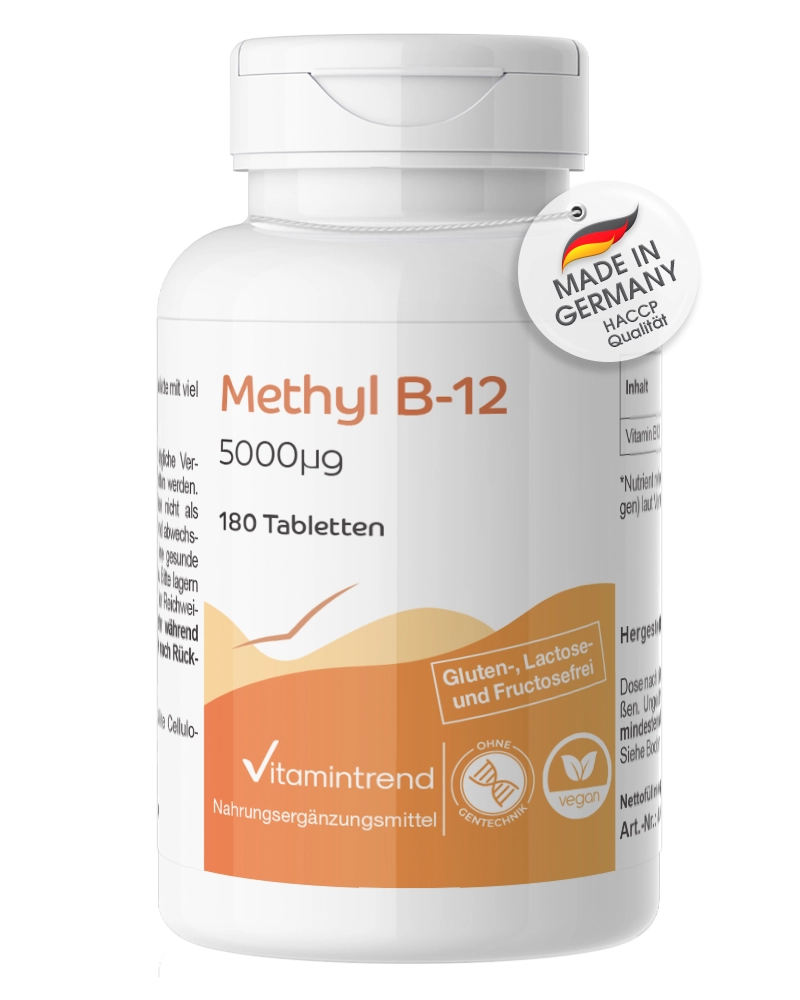 Methyl B-12 5000µg - Methylcobalamin - 180 Tabletten - Großpackung - sehr hochdosiert und vegan | Vitamintrend