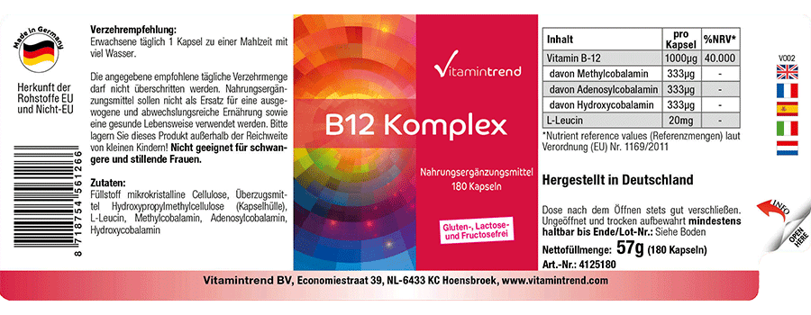 Produktinformationen "Vitamin B12 Komplex - 180 Kapseln - vegan - Großpackung | Vitamintrend"