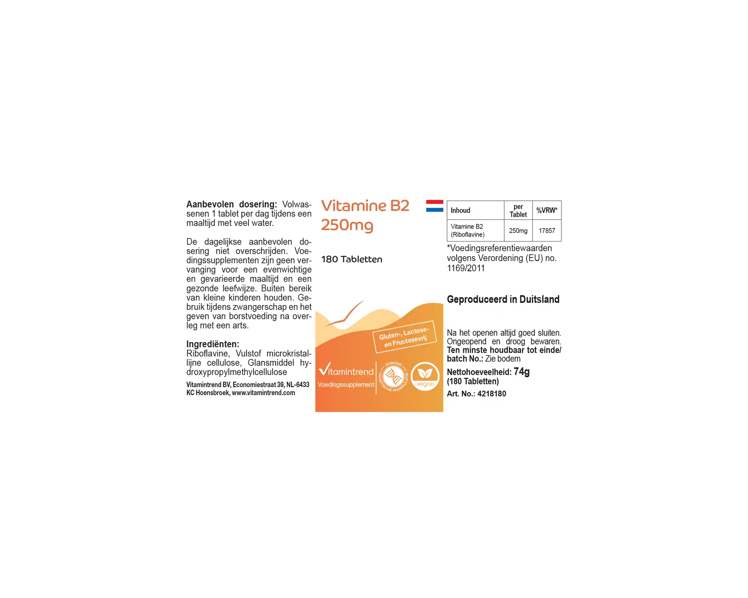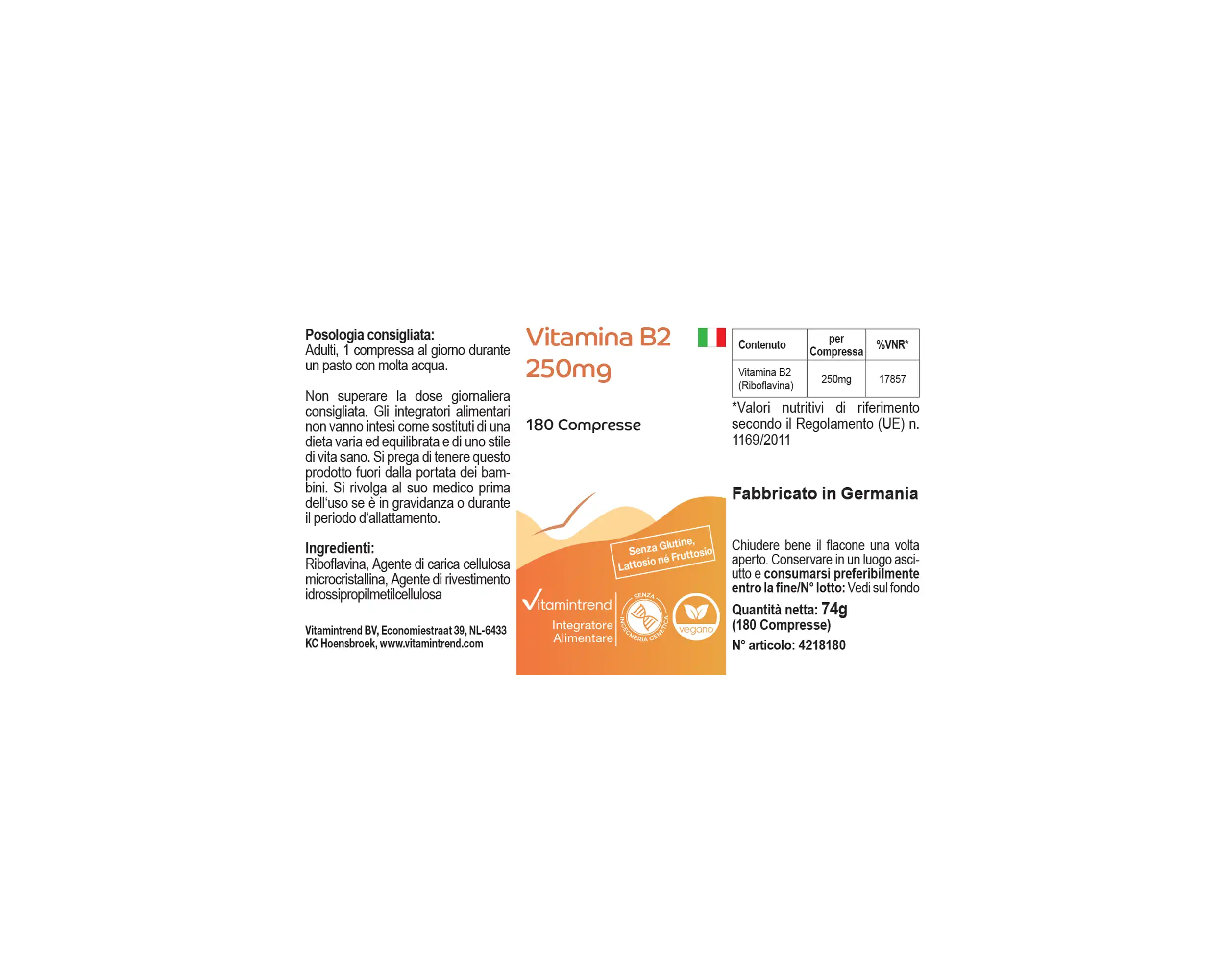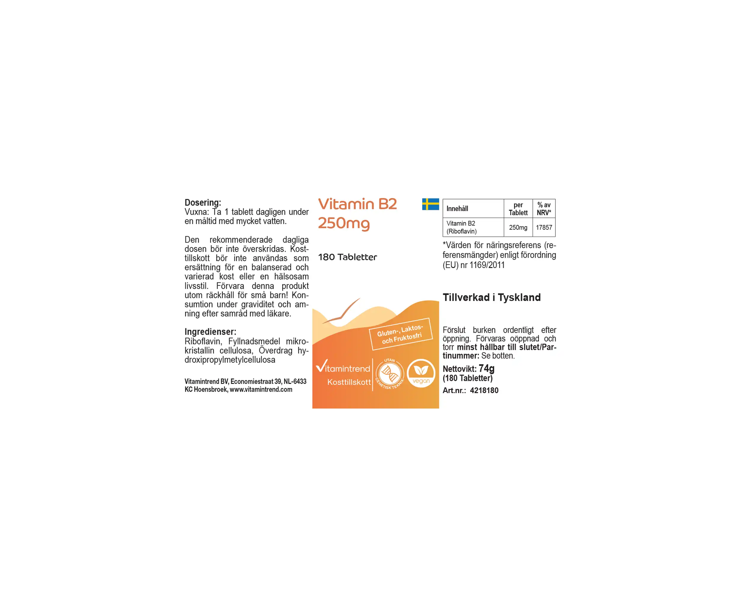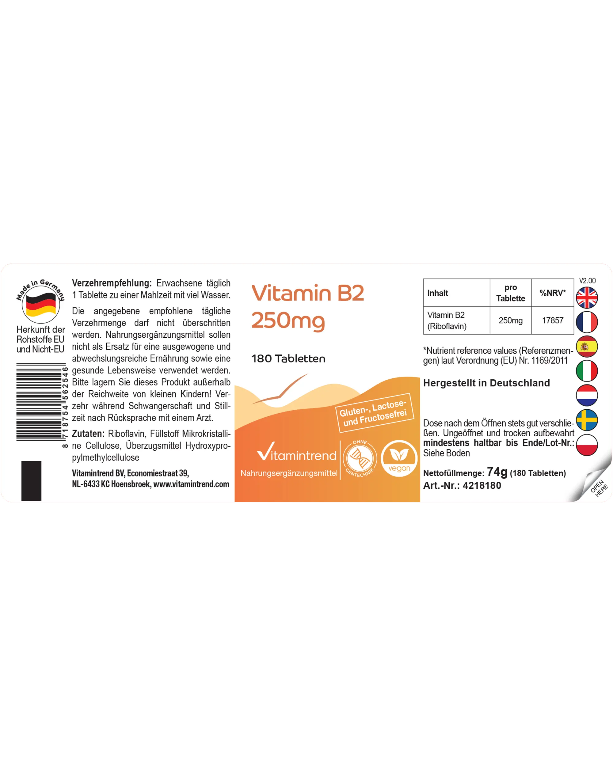 Produktinformationen "Vitamin B2 250 mg – 180 Tabletten – schluckfreundlich - über 100 % Bedarfsabdeckung | Vitamintrend"