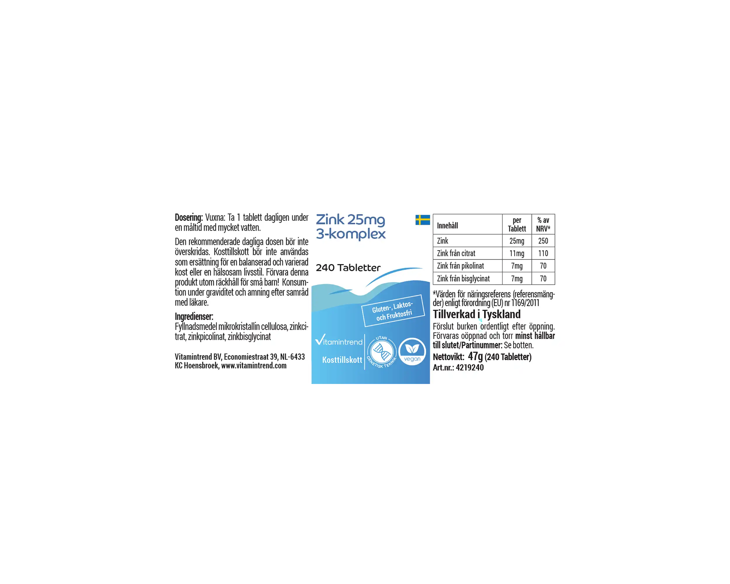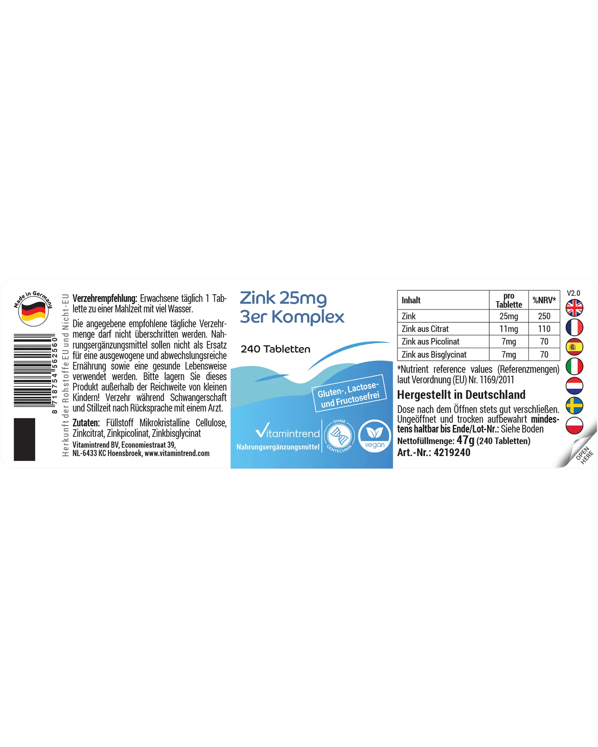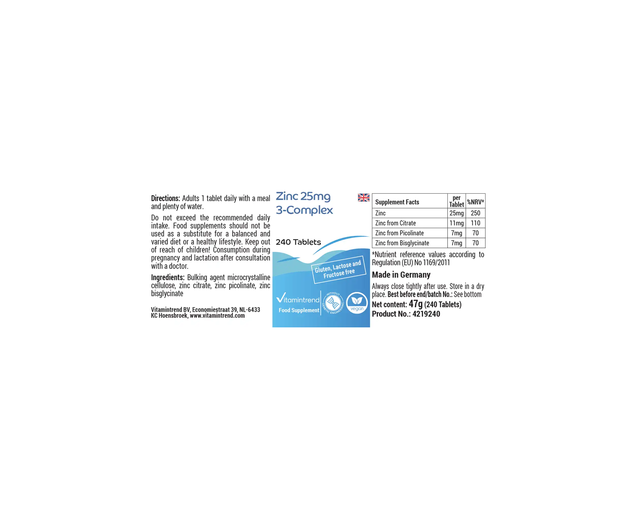 Zink 25mg 3er Komplex - 240 Tabletten - schluckfreundlich | Vitamintrend