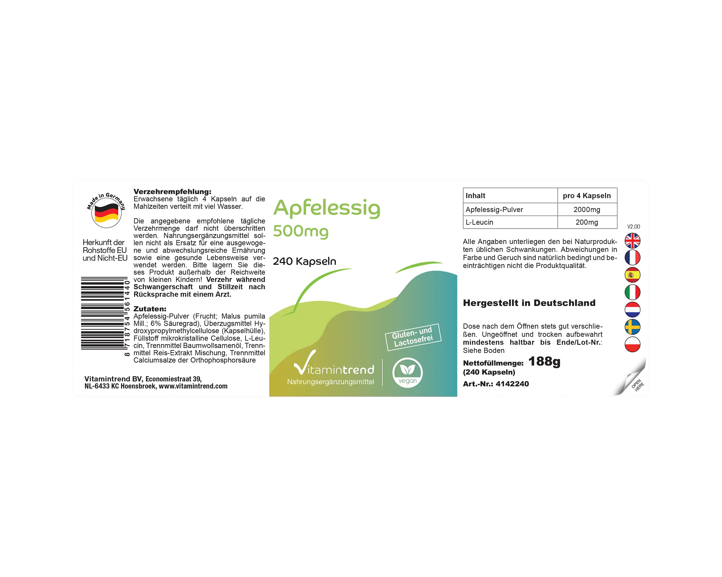 | Apfelessig-Pulver / Apple Cider Vinegar Powder / Vinaigre de Cidre en Poudre / Vinagre de Manzana en Polvo / Aceto di Mele in Polvere / Appelazijn Poeder | 2000mg |