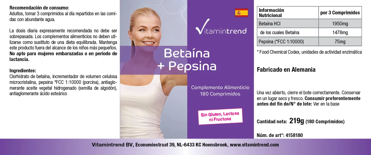 Ingredients: Betaine hydrochloride, bulking agent microcrystalline cellulose, pepsin *FCC 1:10000 (from pork), anti-caking agent cottonseed oil, anti-caking agent stearic acid.
