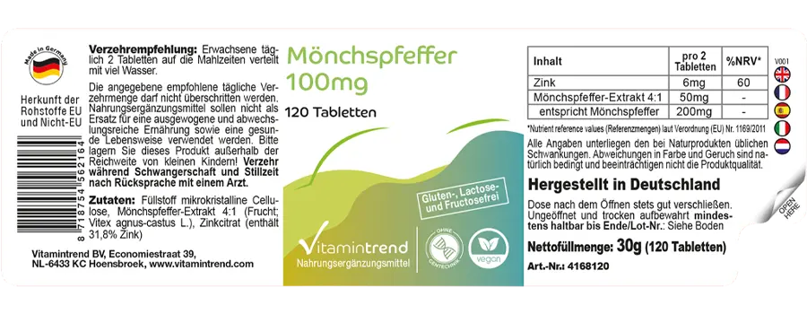 Ingredients: Bulking Agent Microcrystalline Cellulose, Chaste Tree Extract 4:1 (Fruit; Vitex agnus-castus L.), Zinc Citrate (contains 31.8% Zinc).