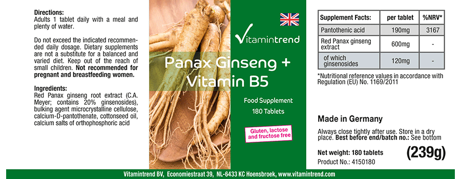 Panax Ginseng + Vitamin B5 - vegan - 180 Tablets - bulk pack