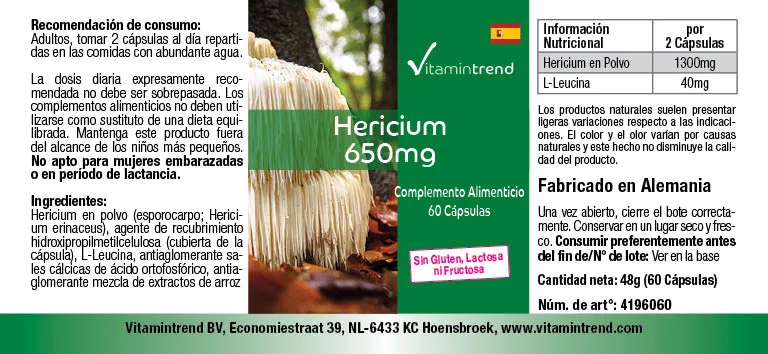 Informations sur le produit "Hericium 650mg - 60 gélules, champignon vital végétalien"