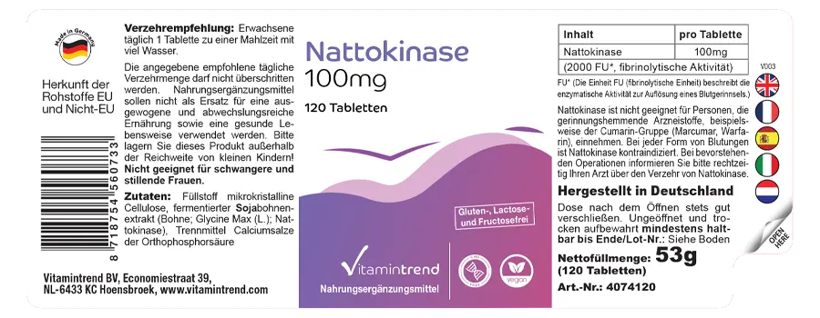 Le compresse di nattokinasi di Vitamintrend forniscono ogni giorno 2000 FU di nattokinasi da 100 mg di estratto di soia fermentata. Con 120 compresse, il formato grande offre una comoda fornitura per 4 mesi. Il prodotto è vegano e privo di coloranti e additivi.