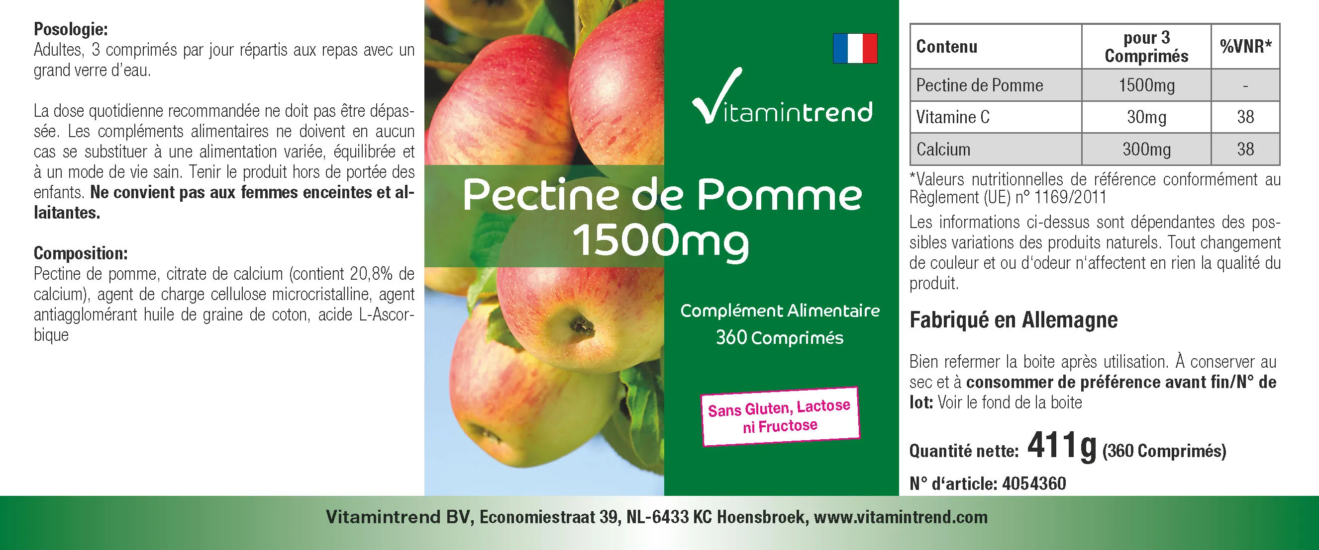 La pectina di mela è una fibra solubile presente nelle pareti cellulari delle piante, in particolare nelle mele, nei pompelmi, nelle arance e nelle albicocche. È apprezzata come componente naturale di una dieta equilibrata.