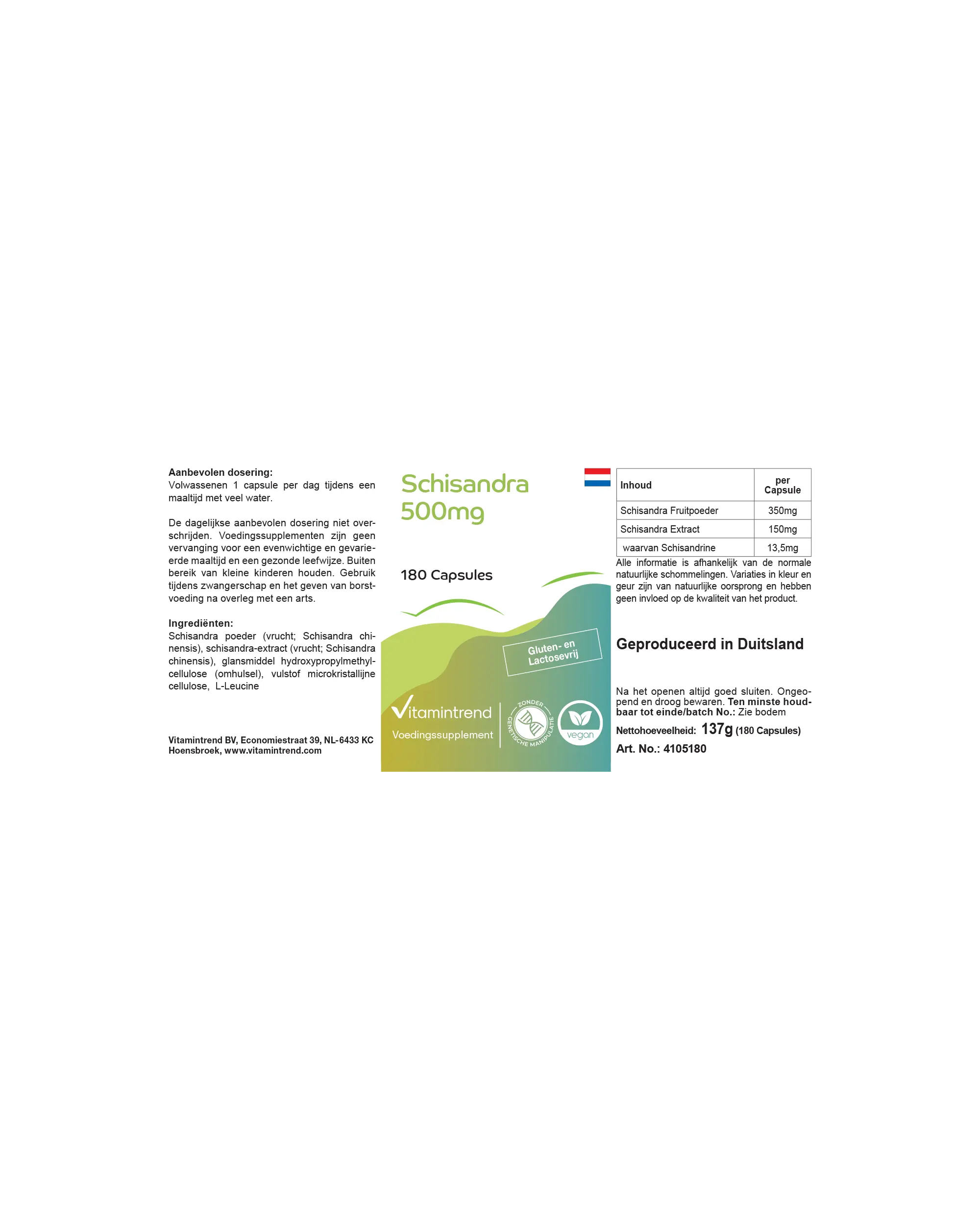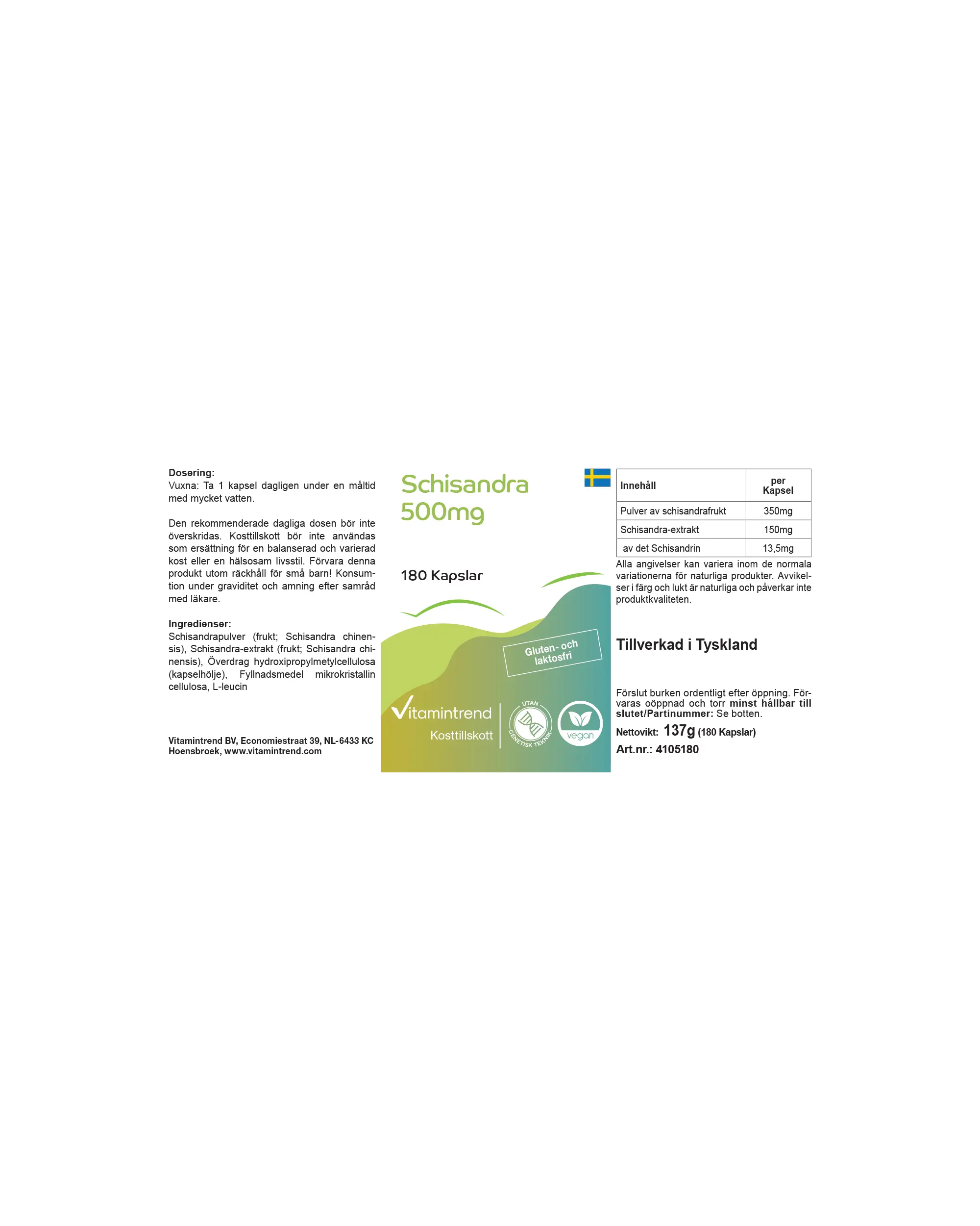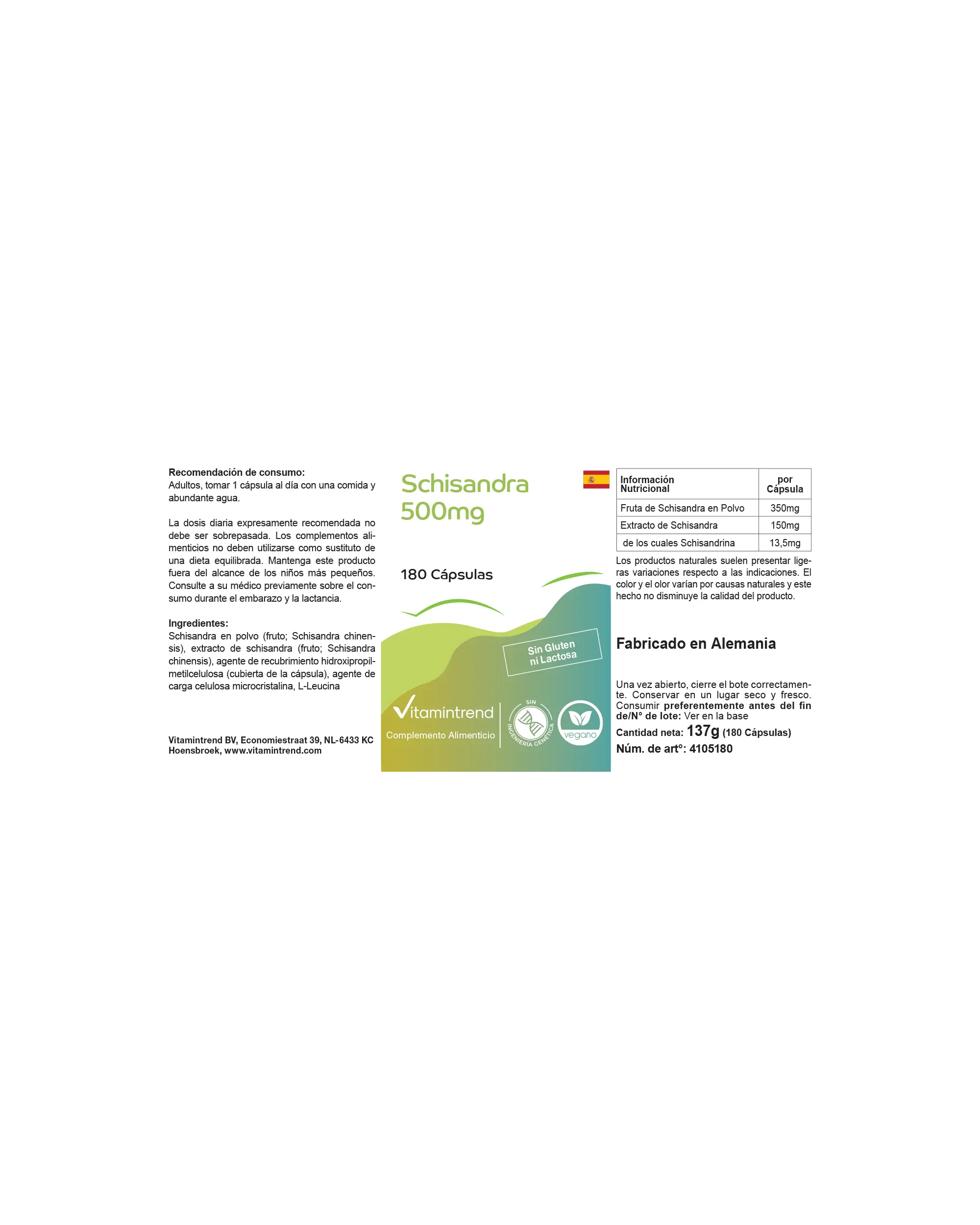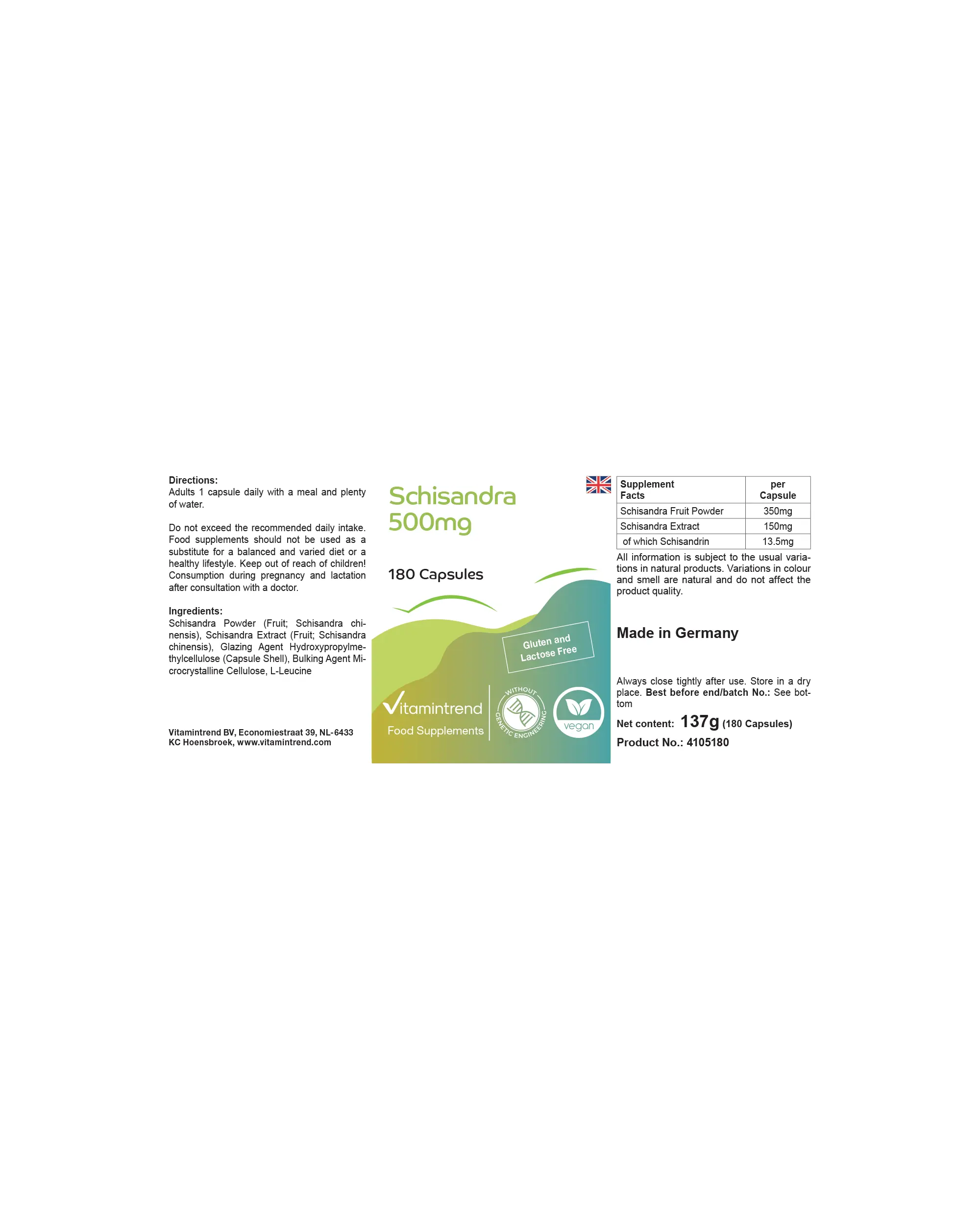 Informazioni sul prodotto "Schisandra 500 mg - 180 capsule - Confezione multipla per 6 mesi - Vegana | Vitamintrend"